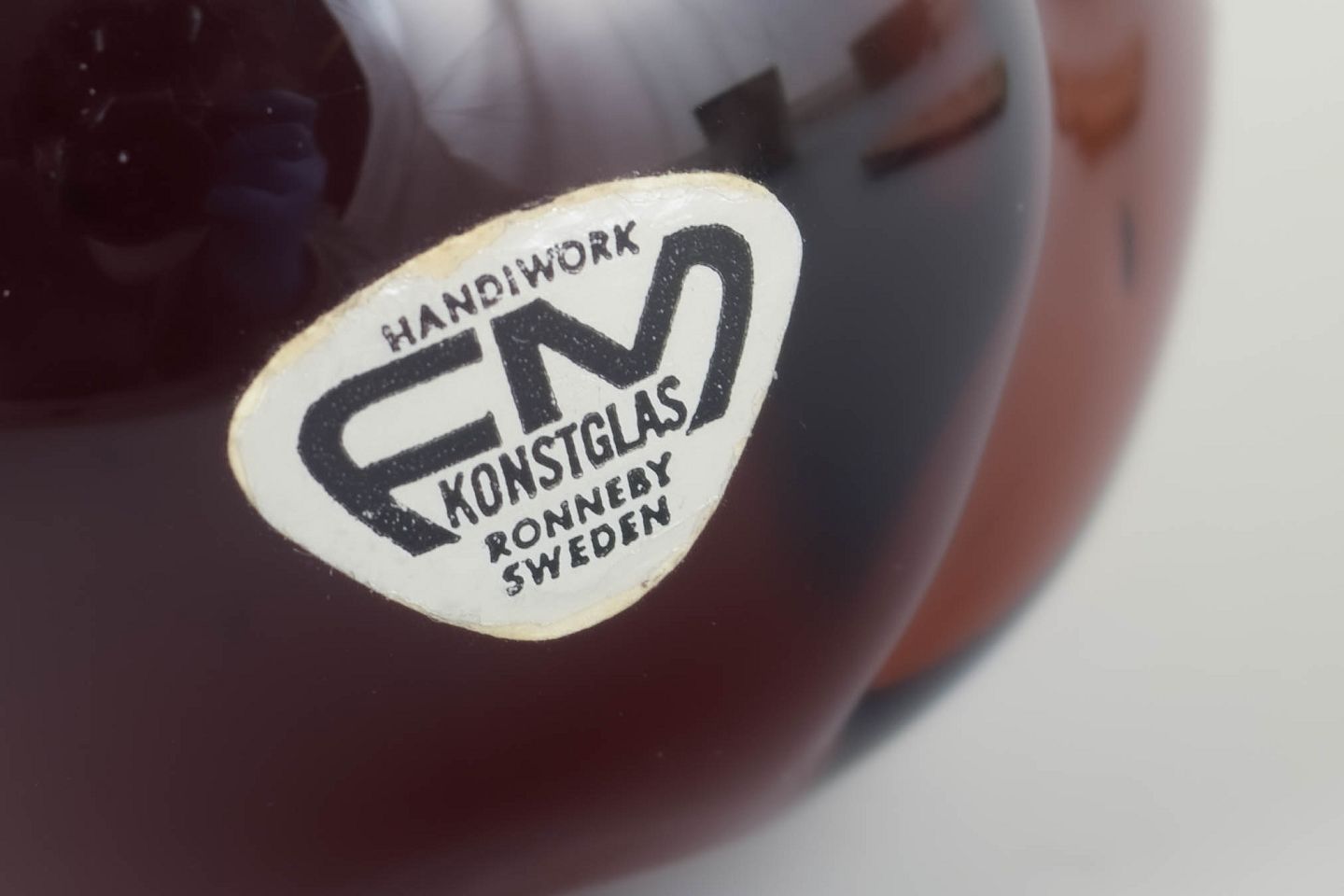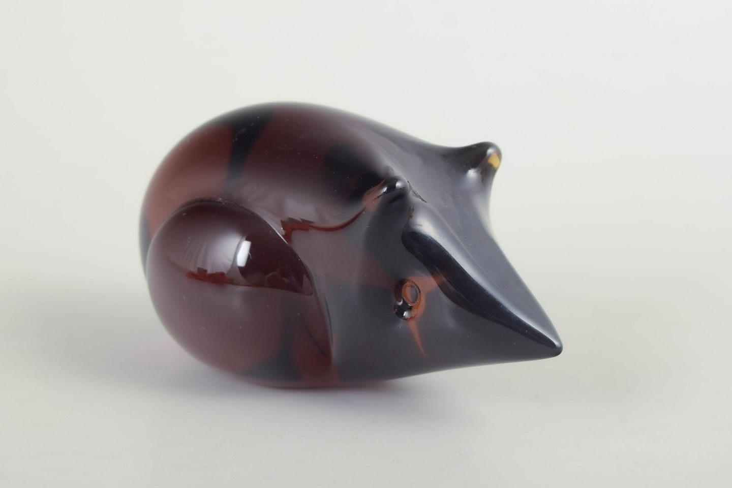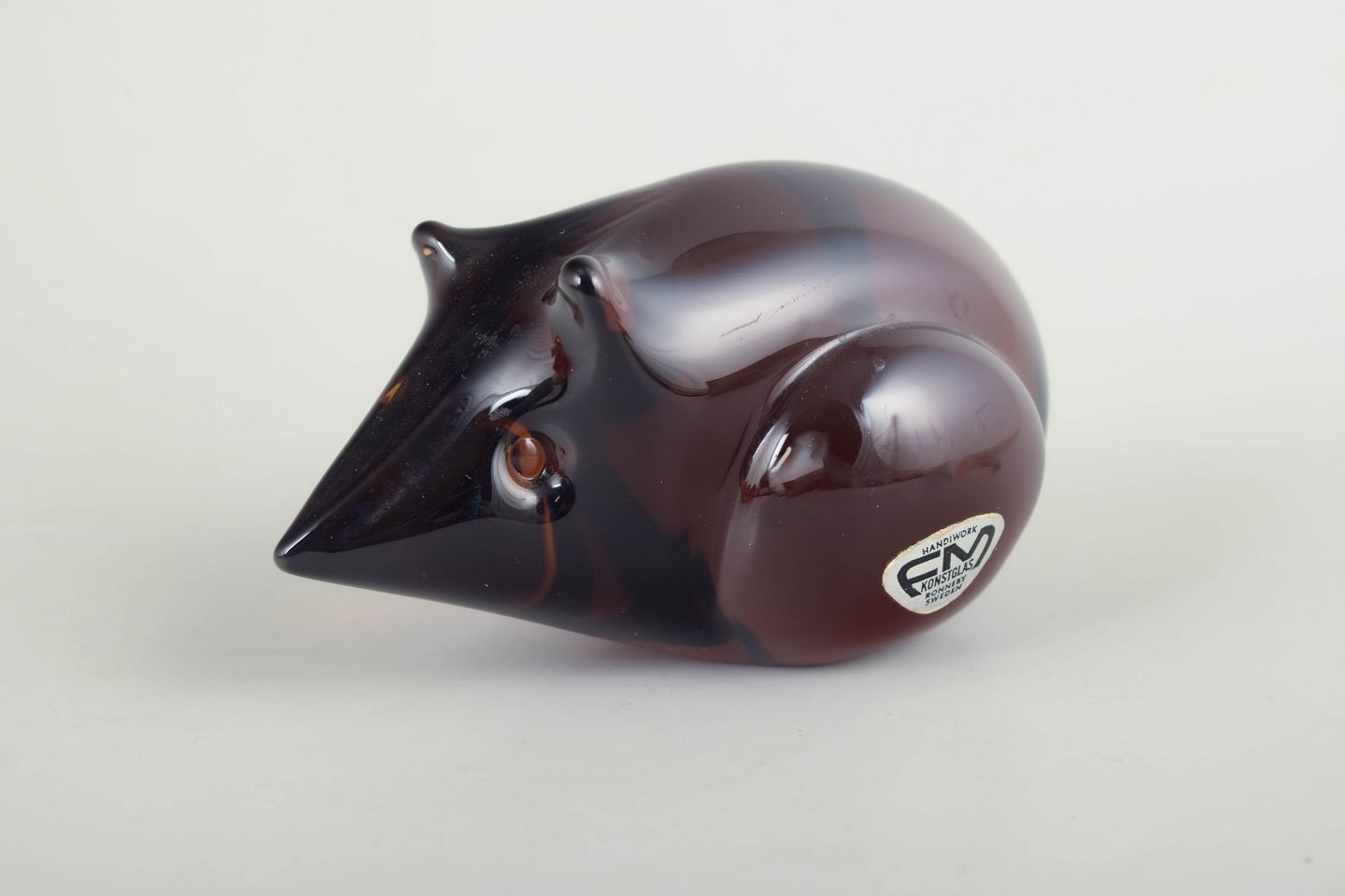 Fm Konstglas, mus, glasskulptur.Dekorativ mus i massivt kunstglas med afrundet korpus i dybe rødbrune nuancer og kontrasterende mørkere hoved. Udført med glat, poleret overflade og stiliserede træk. Med originalt mærkat fra FM Konstglas, Ronneby.