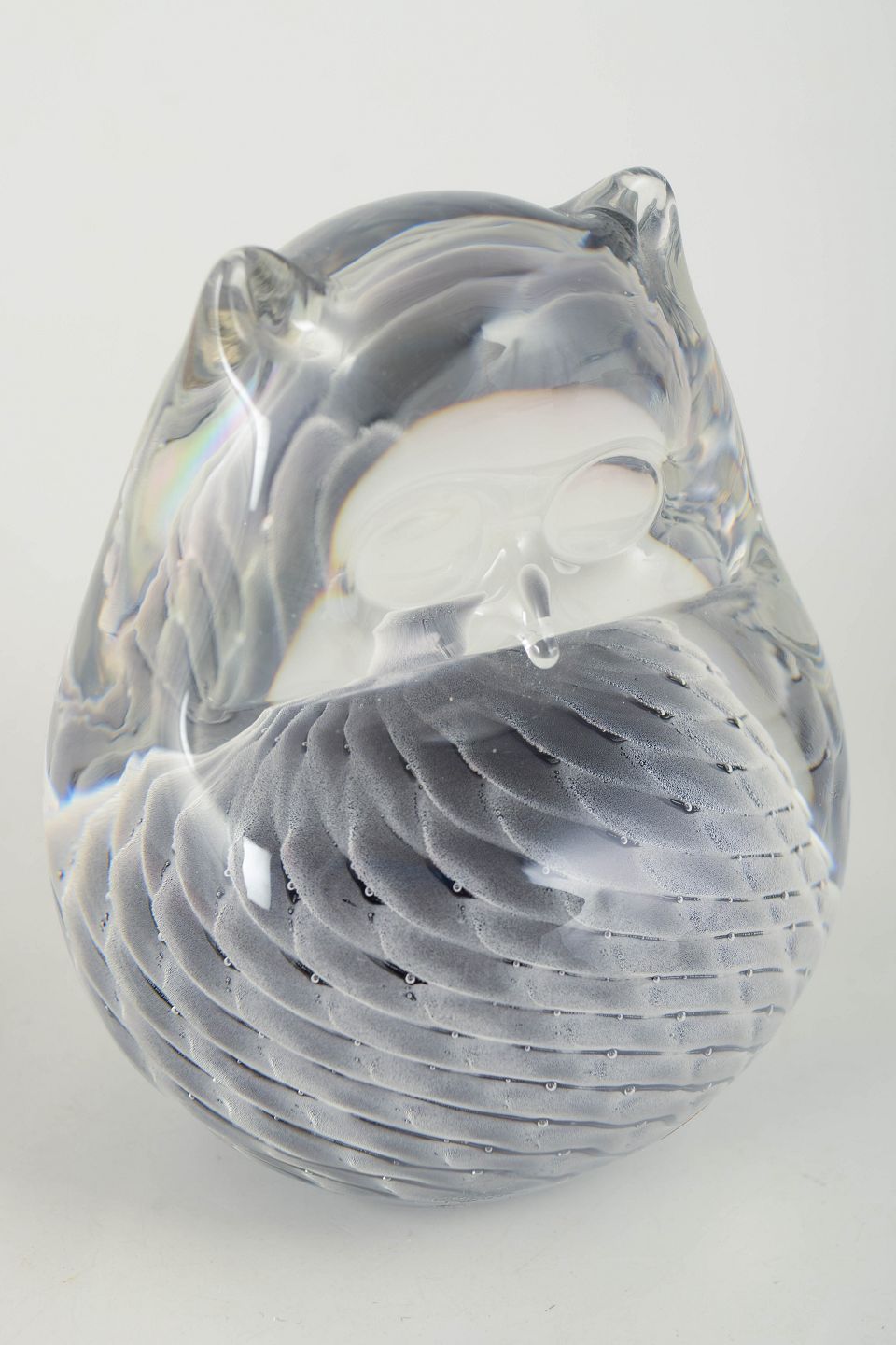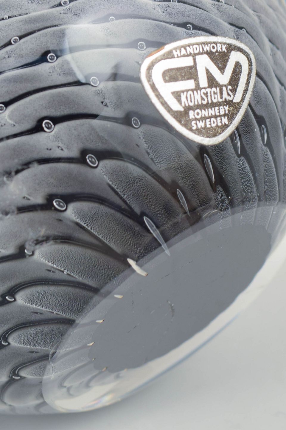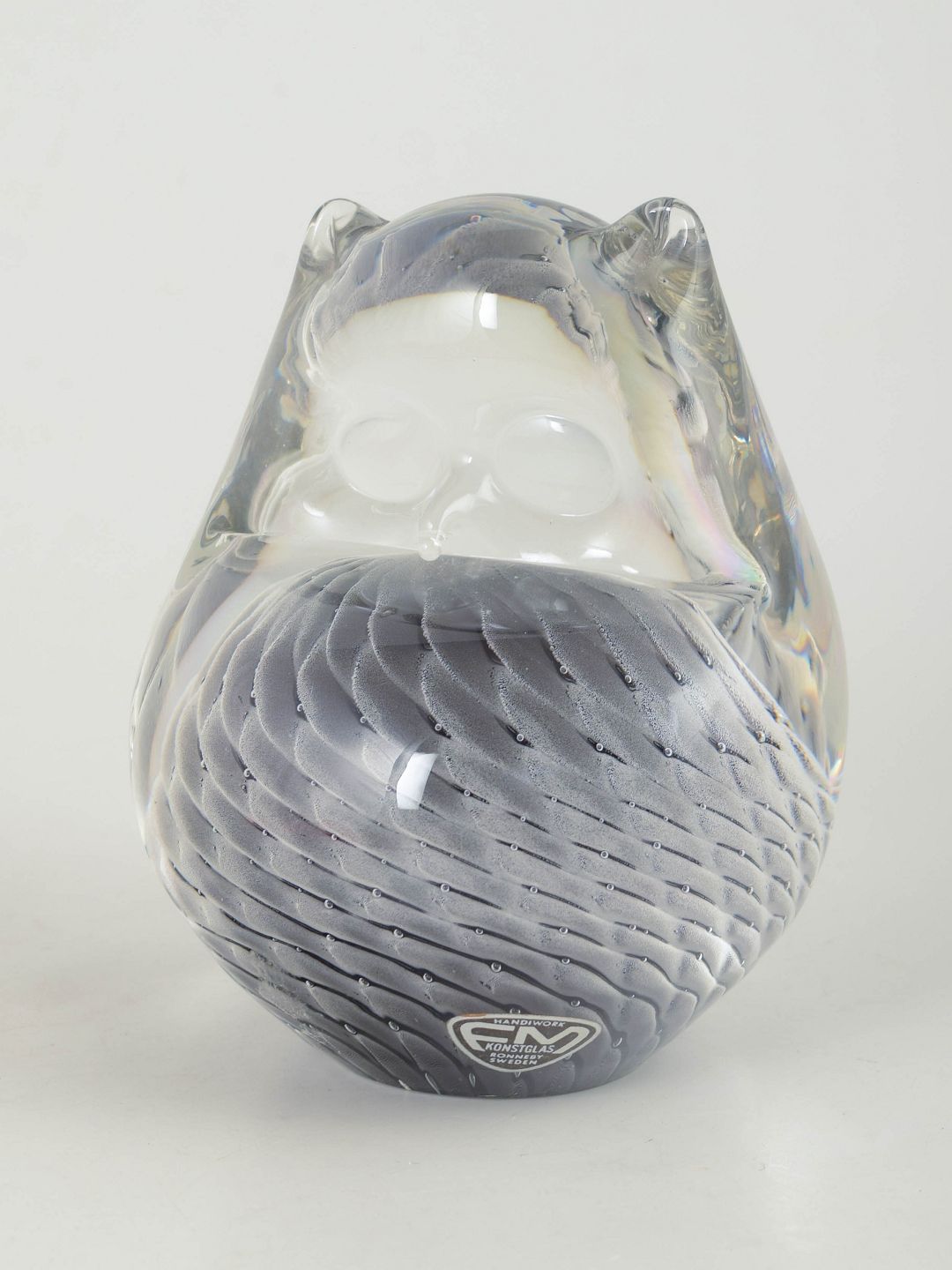 Fm Konstglas, ugle, glasskulptur.Dekorativ ugle i massivt kunstglas med klar overdel og indre mønster i grå og violette nuancer. Udført med spiralformet struktur i korpus og blødt modelleret hoved. Med originalt mærkat fra FM Konstglas, Ronneby.