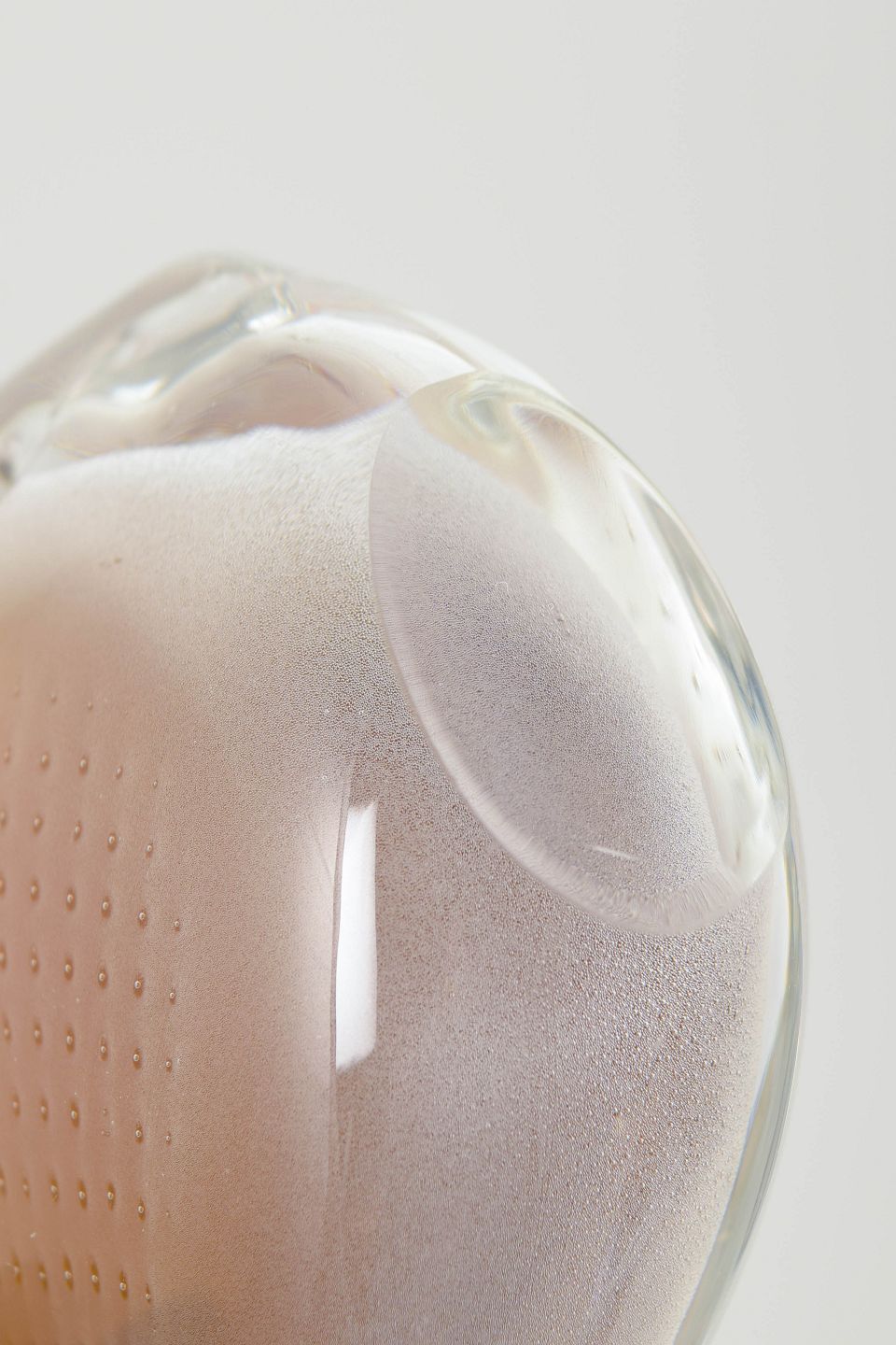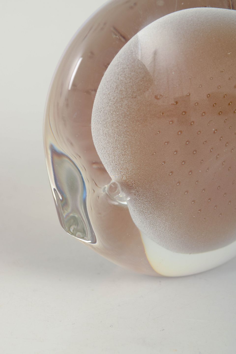 Organisk formet fisk i massivt kunstglas med bløde konturer i rosa og hvide toner. Udført med indkapslede luftbobler og matteret parti.