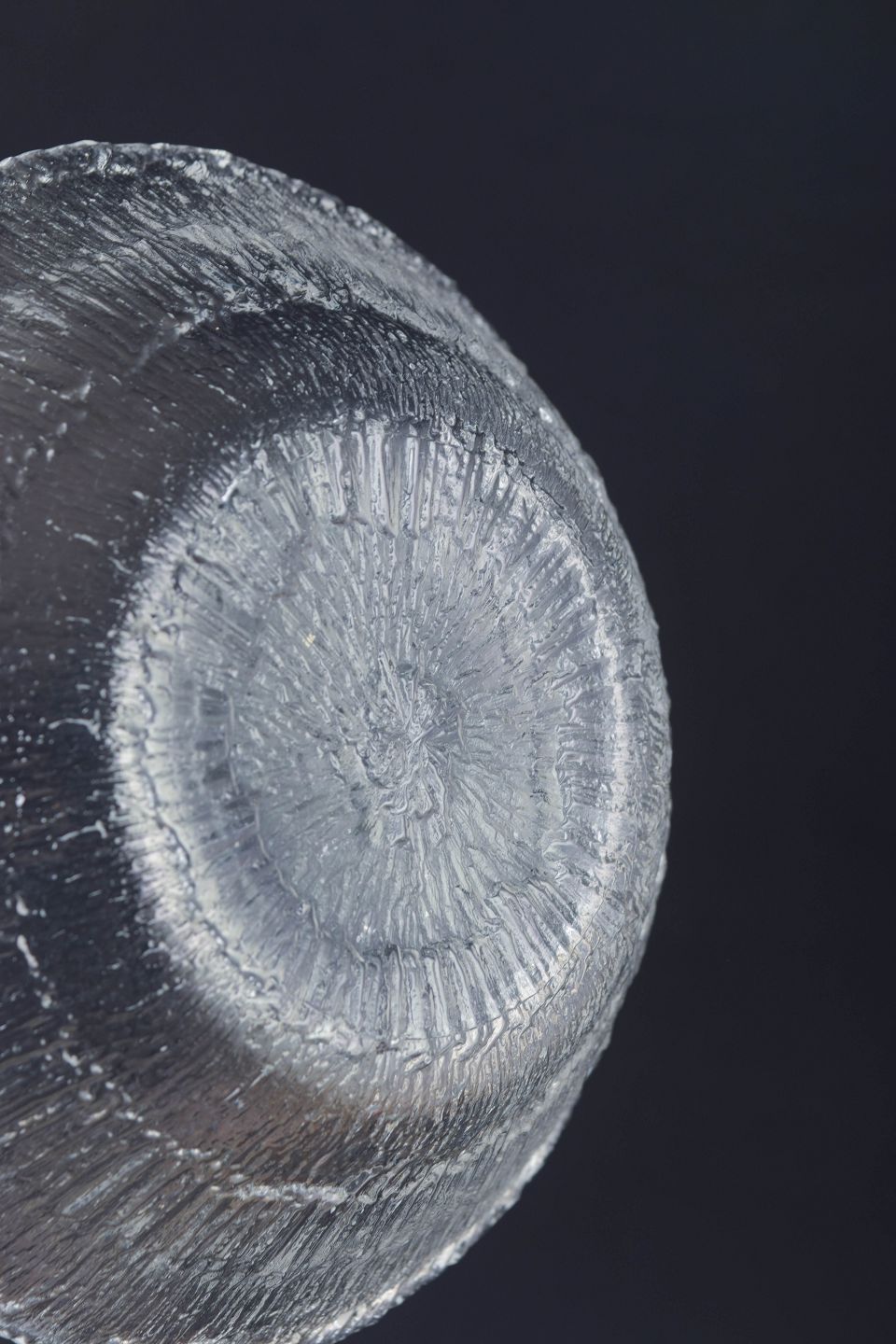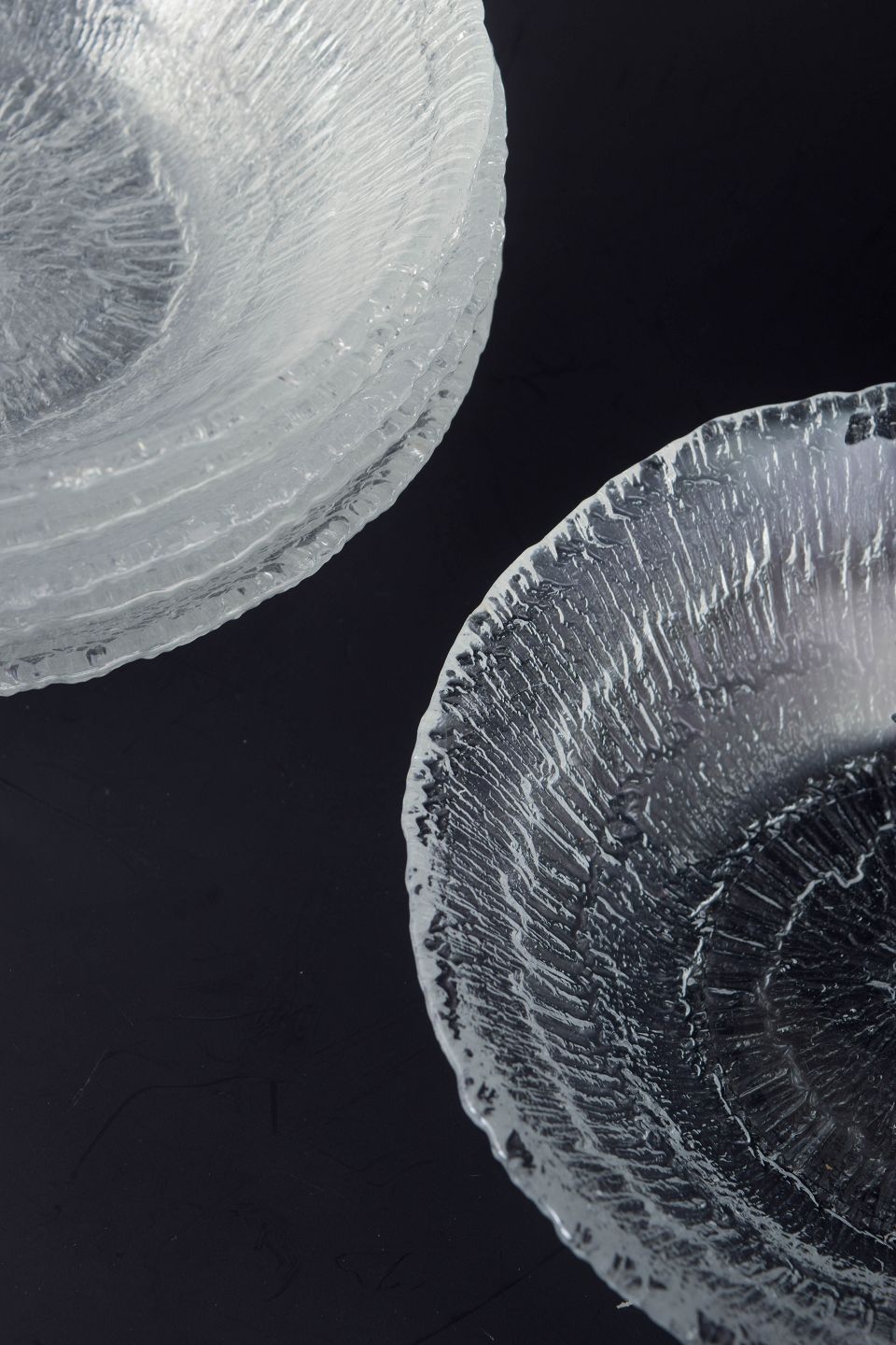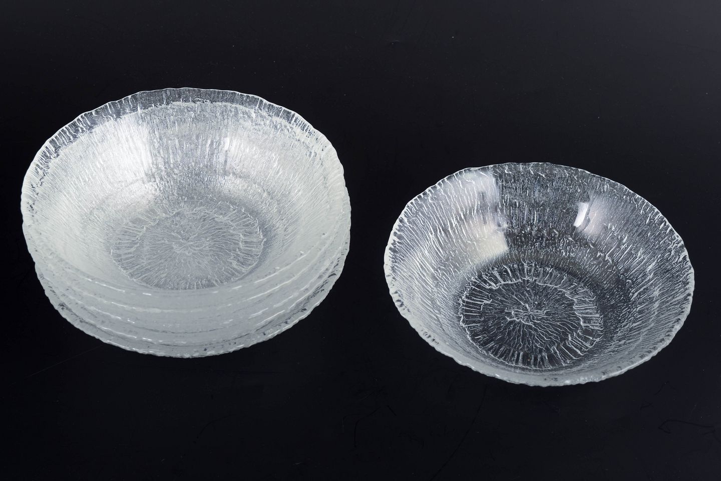 Tapio Wirkkala for Iittala, sæt på seks skåle.Sæt på seks skåle i presset klart glas fra serien Ultima Thule, kendetegnet ved den karakteristiske, strukturerede overflade inspireret af smeltende is og nordisk natur. Uden mærkning.