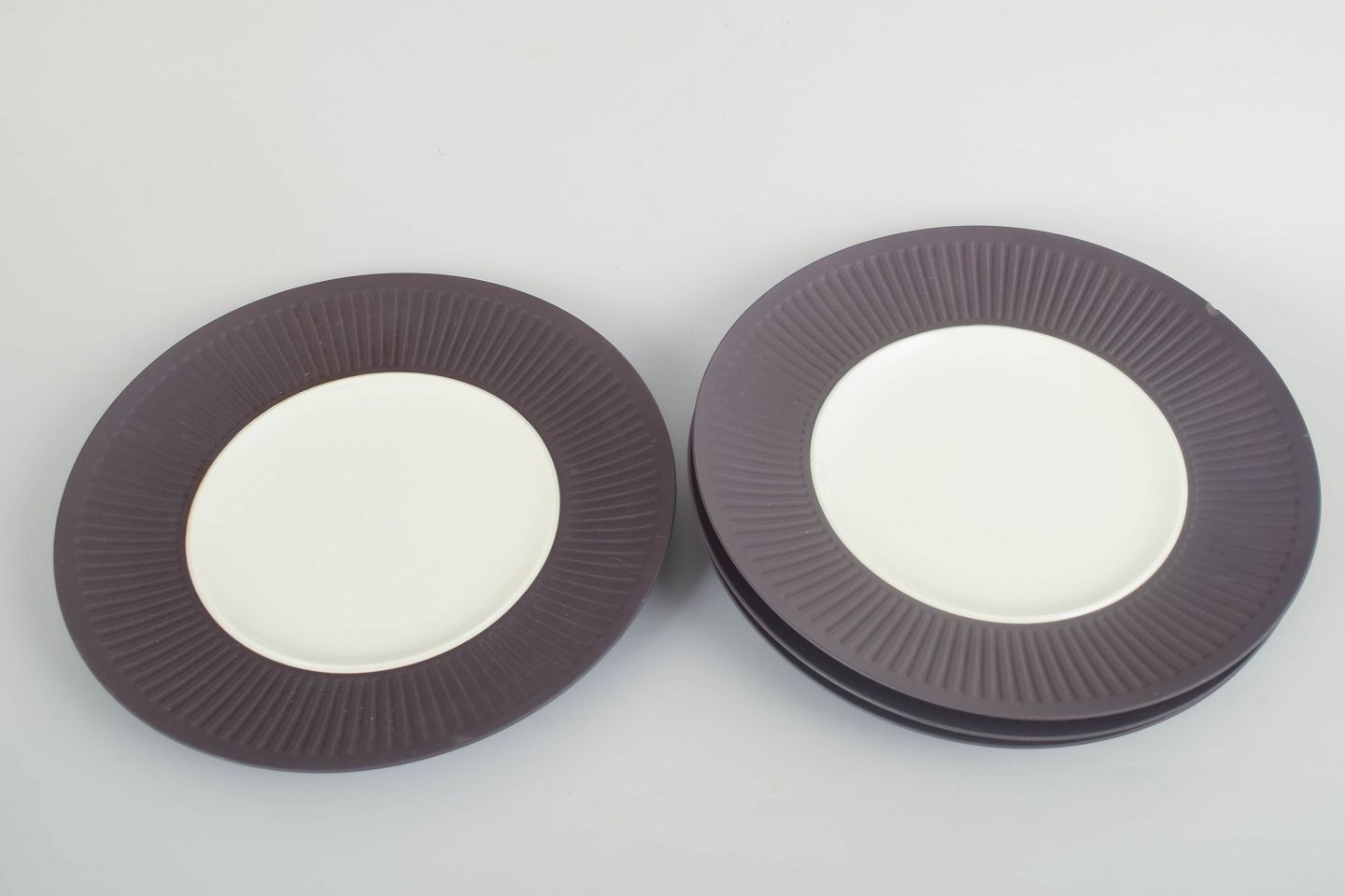 Jens Harald Quistgaard for Dansk Designs, sæt på 3 middagstallerkener.Sæt bestående af tre middagstallerkener i stentøj med hvid glasur og rillet fane samt lys glasur i spejlet.