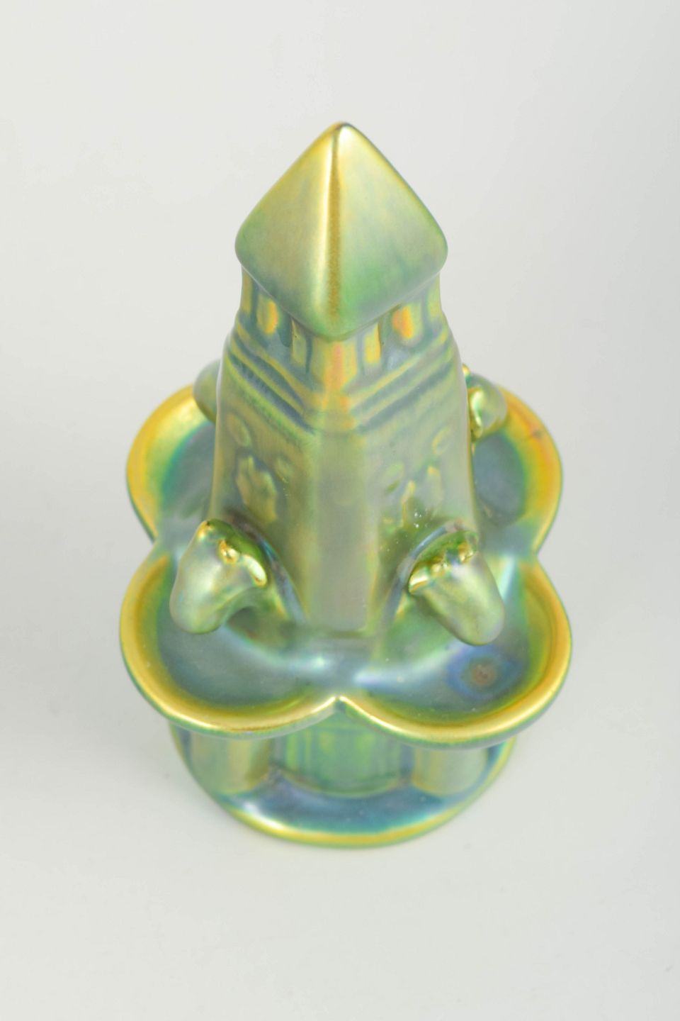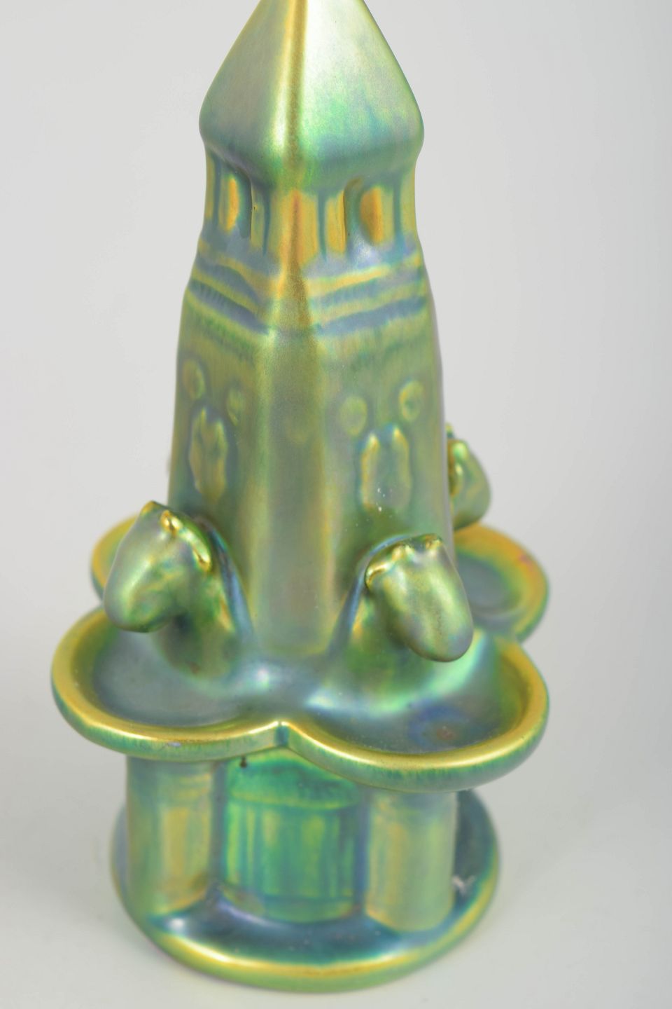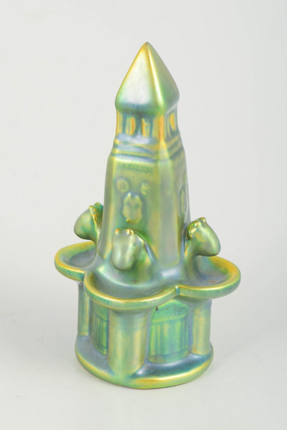 Zsolnay, fontæne i eosin-glasur.Skulpturel fontæne i stentøj med iriserende eosin-glasur i grønne og gyldne nuancer. Udført i geometrisk og stiliseret form med arkitektoniske detaljer i art deco-stil.