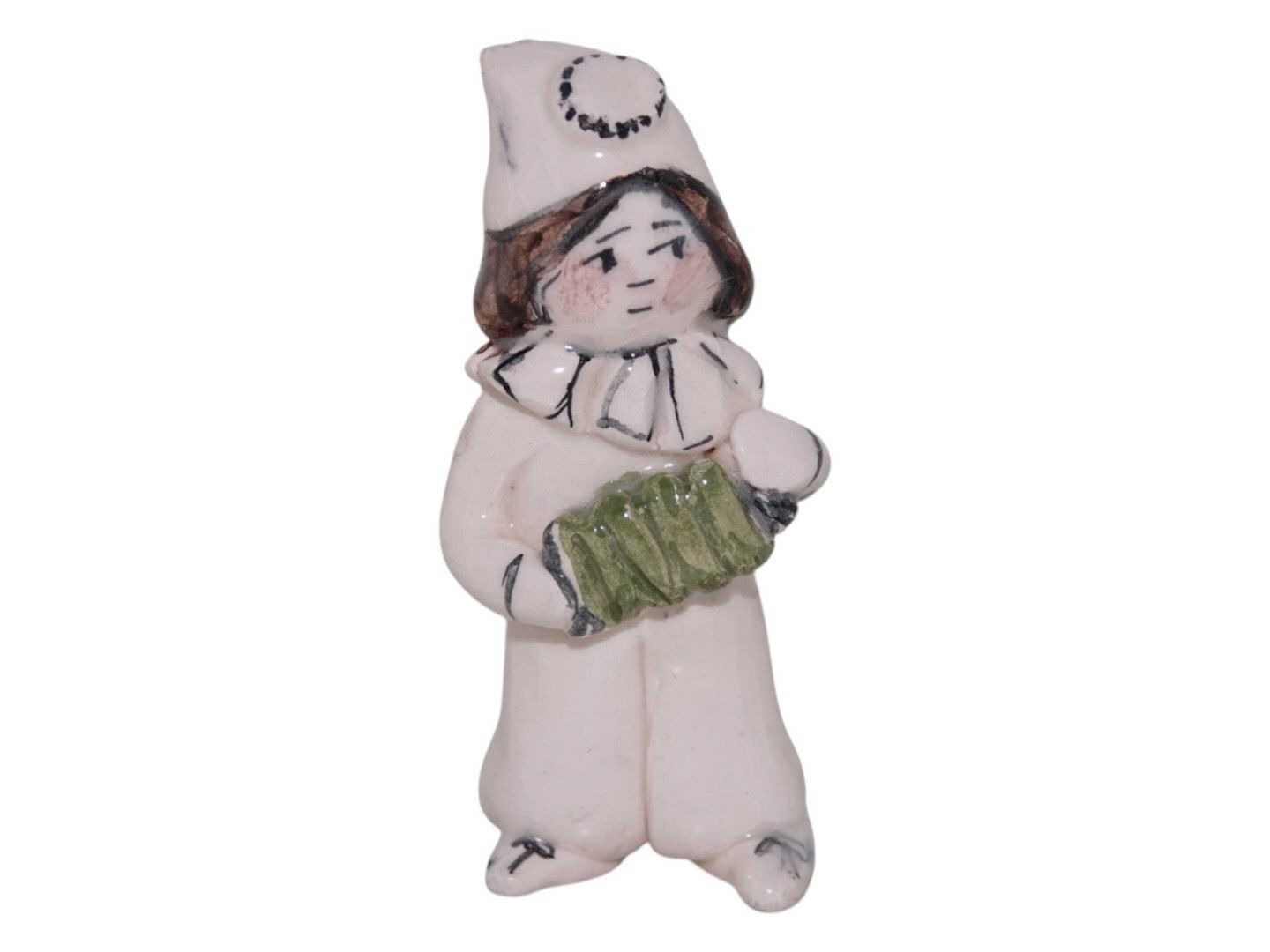 Doreen Middelboe keramik, lille figur af pige i harlekin tøj og med harmonika.Dette stammer fra en større samling fra Doreen Middelboes eget hjem.