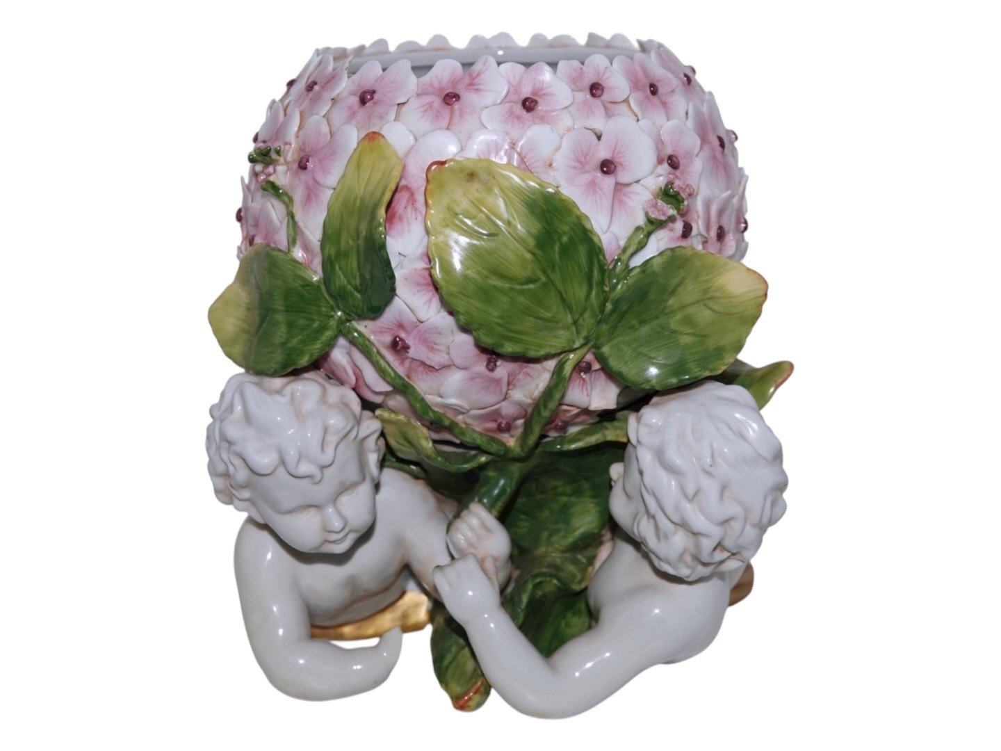 German porcelain, two large flower pots with angels from around 1900.Height 21 cm., length 21 cm.