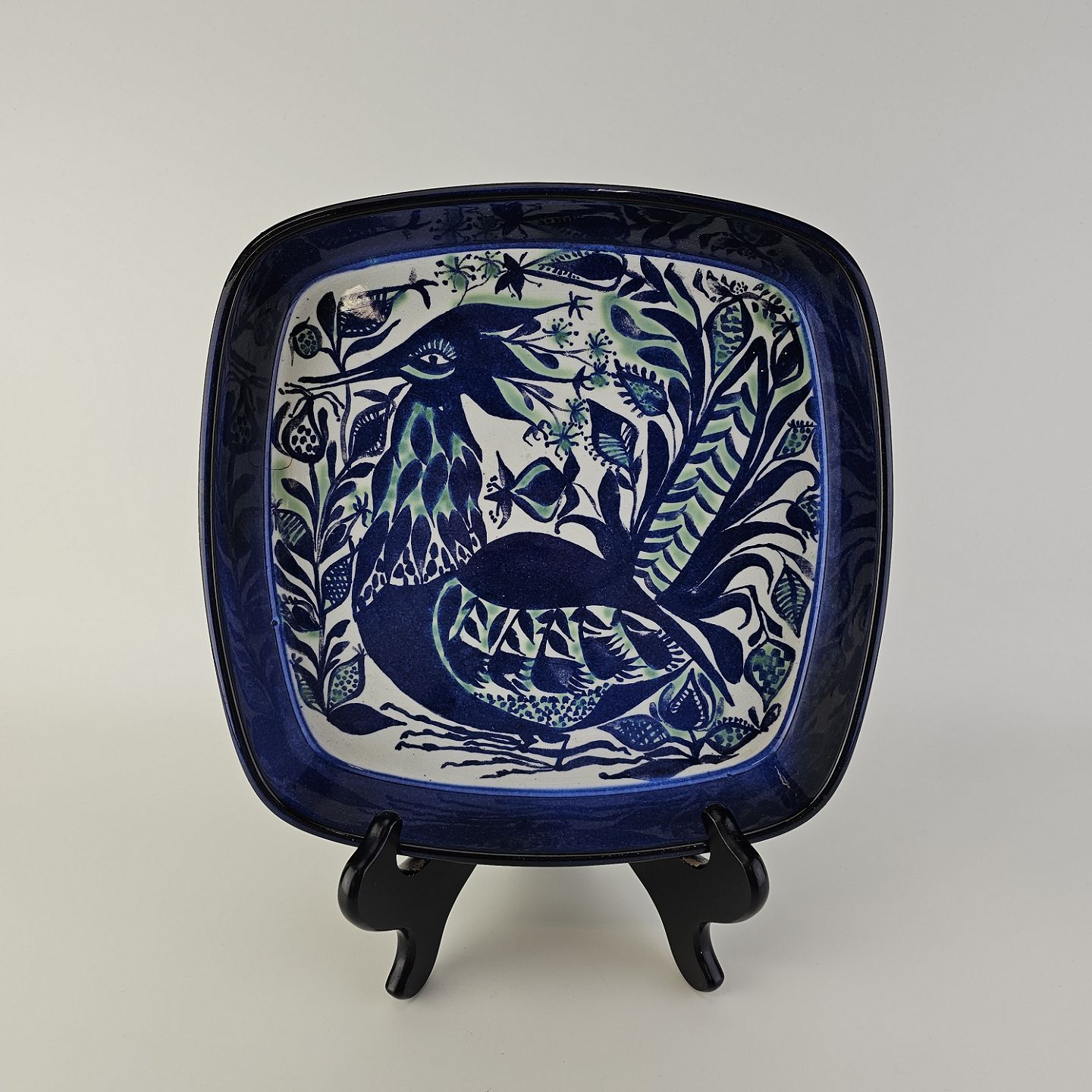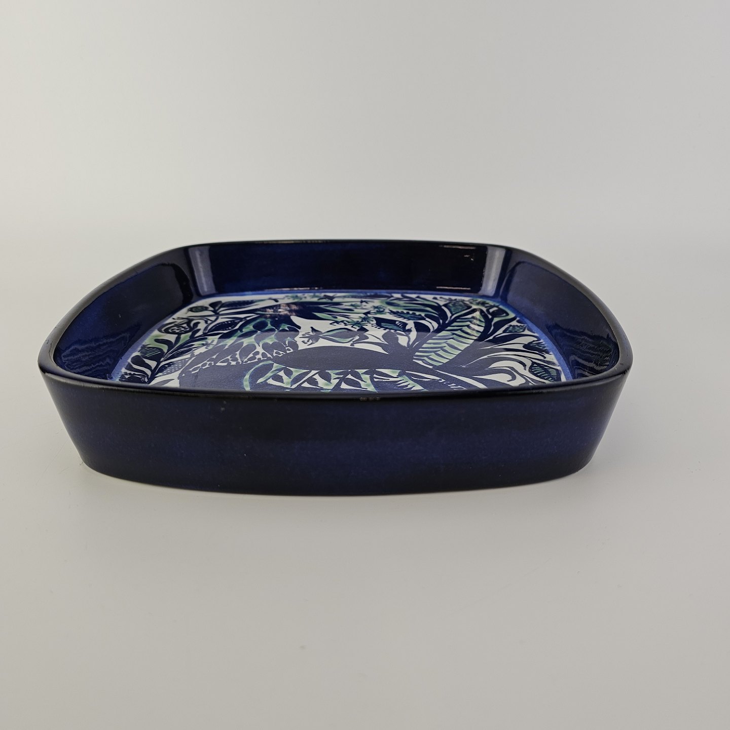 Firkantet fad fra serien Tenera i fajance med dekoration af en fugl i blå nuancerNr. 143/2884