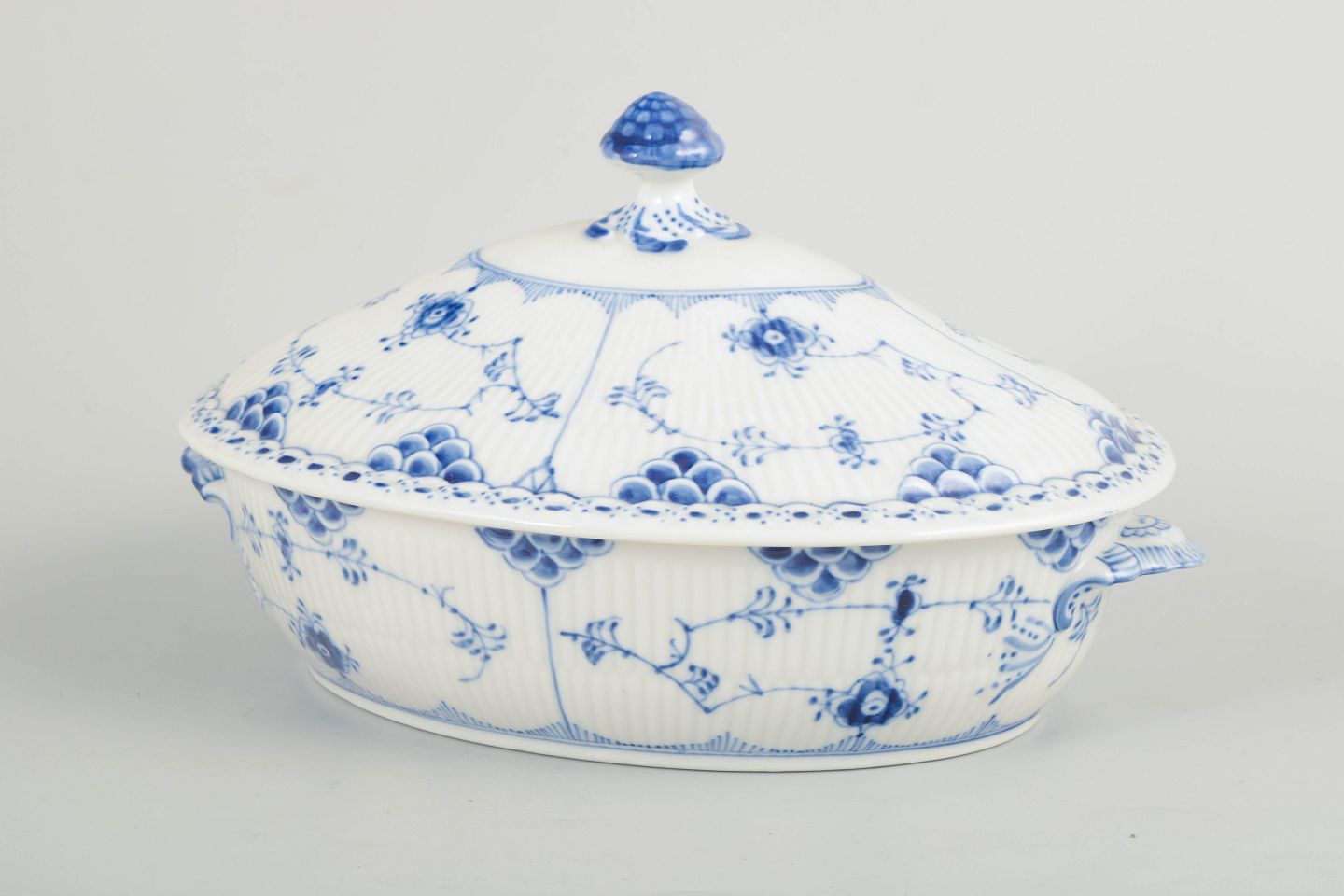 Royal Copenhagen Musselmalet Halvblonde, terrin med låg.Terrin med låg i håndmalet porcelæn fra Musselmalet Halvblonde med klassisk underglasurdekoration i koboltblå, riflede felter og karakteristisk blondekant. Model 1/622. Første sortering. Fremstillet 1964.