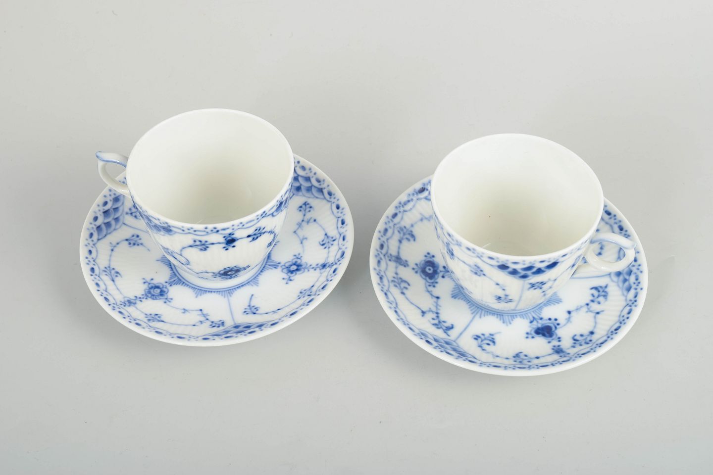 Royal Copenhagen Musselmalet Halvblonde, sæt af to kaffekopper med tilhørende underkopper.Sæt af to kaffekopper med tilhørende underkopper i håndmalet porcelæn fra Musselmalet Halvblonde med klassisk underglasurdekoration i koboltblå, riflede felter og karakteristisk blondekant. Model 1/756. Første sortering. Fremstillet 1966.