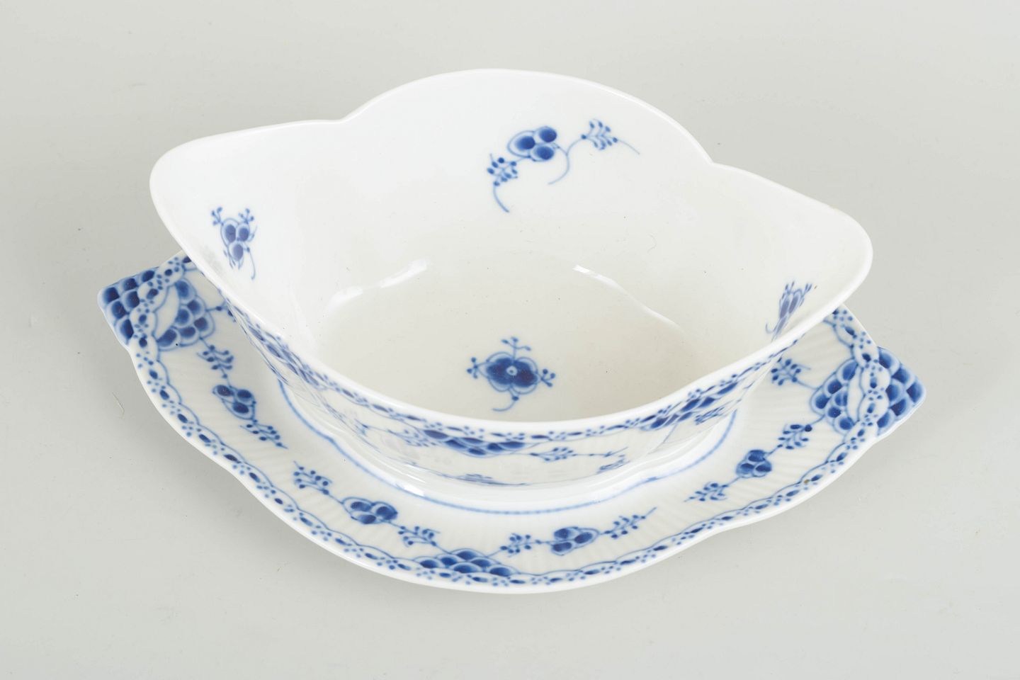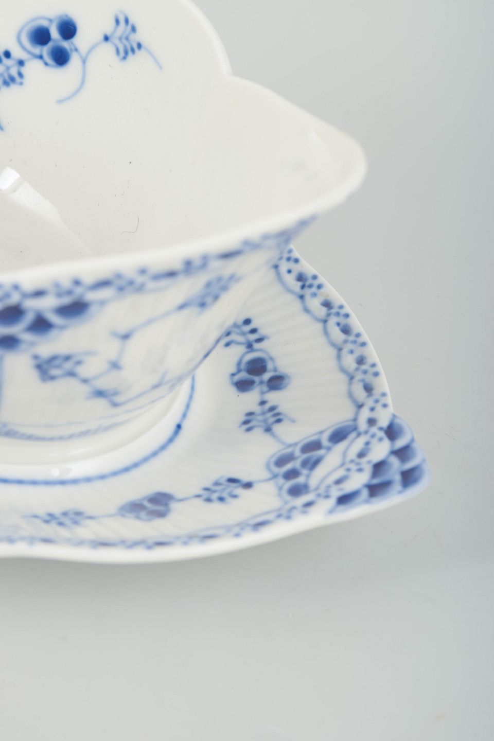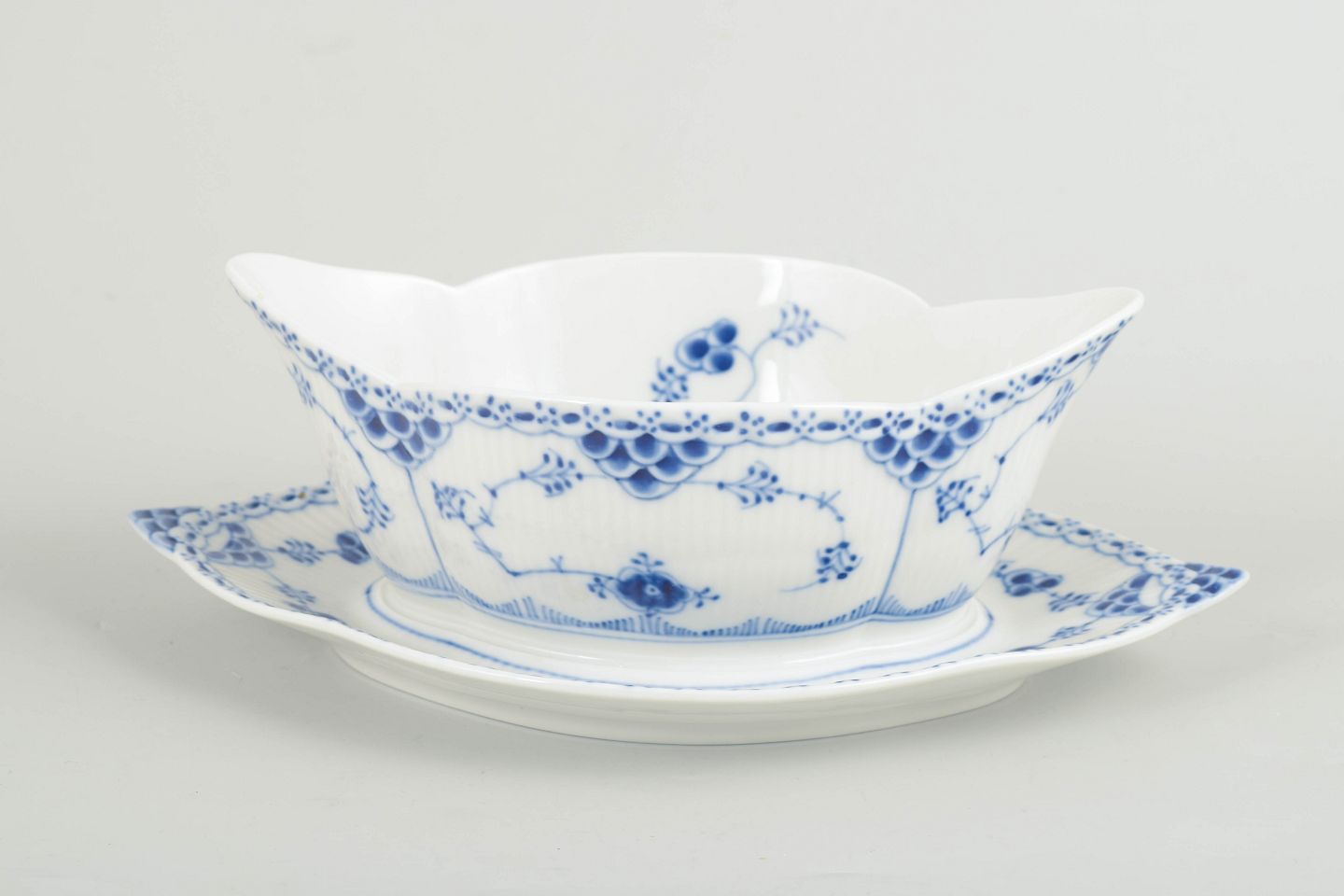 Royal Copenhagen Musselmalet Halvblonde, saucekande med underfad.Saucekande med underfad i håndmalet porcelæn fra Musselmalet Halvblonde med klassisk underglasurdekoration i koboltblå, riflede felter og karakteristisk blondekant. Model 1/587. Første sortering. Fremstillet 1965.