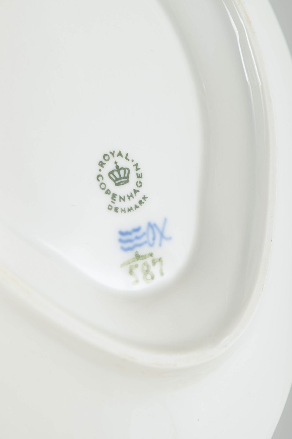 Royal Copenhagen blev grundlagt i 1775 i København under kongelig bevilling. Fabrikken er internationalt anerkendt for sit håndmalede porcelæn og sit høje kunstneriske niveau. Musselmalet Halvblonde er en variation af det klassiske Musselmalet stel og kombinerer riflede flader med en dekorativ blondekant, udført med stor håndværksmæssig præcision.