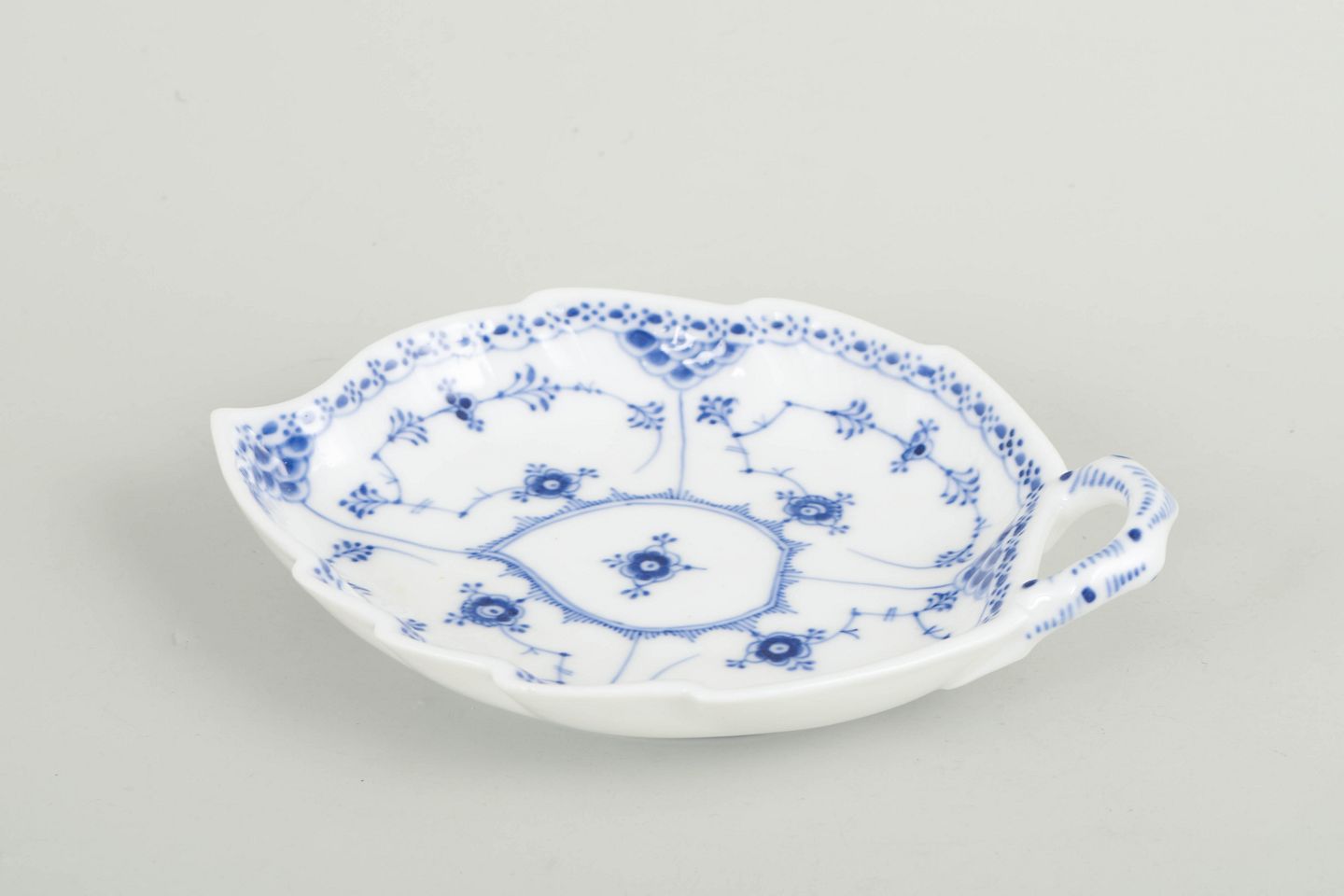 Royal Copenhagen Musselmalet Halvblonde, fad med hank.Fad med hank i håndmalet porcelæn fra Musselmalet Halvblonde med klassisk underglasurdekoration i koboltblå, riflede felter og karakteristisk blondekant. Model 1/547. Første sortering. Fremstillet i 1920’erne.
