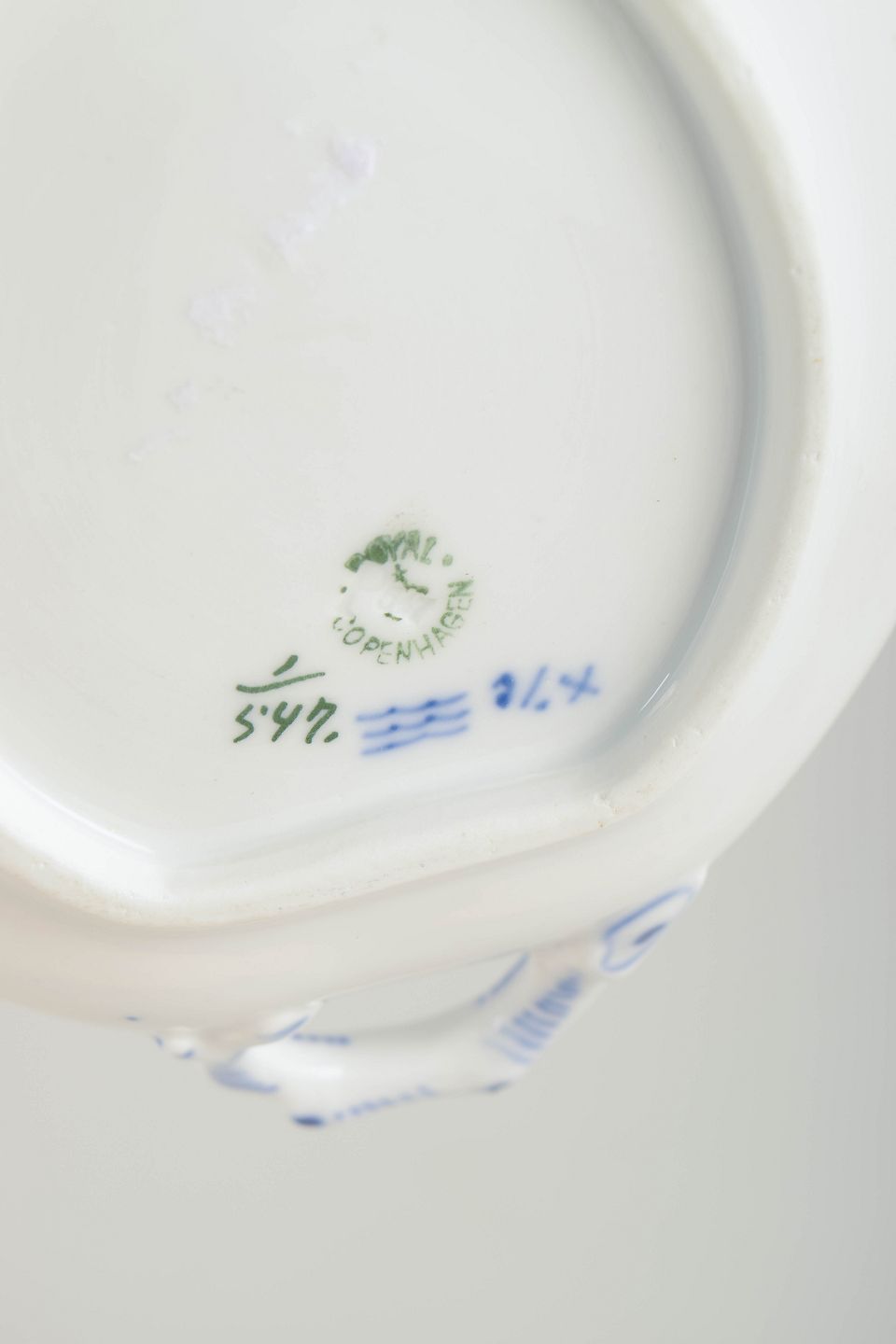 Royal Copenhagen blev grundlagt i 1775 i København under kongelig bevilling. Fabrikken er internationalt anerkendt for sit håndmalede porcelæn og sit høje kunstneriske niveau. Musselmalet Halvblonde er en variation af det klassiske Musselmalet stel og kombinerer riflede flader med en dekorativ blondekant, udført med stor håndværksmæssig præcision.