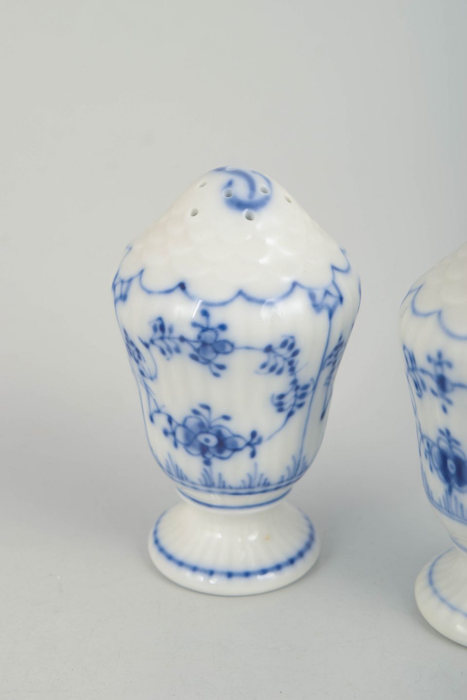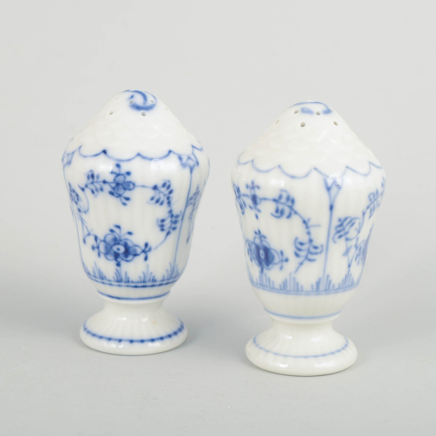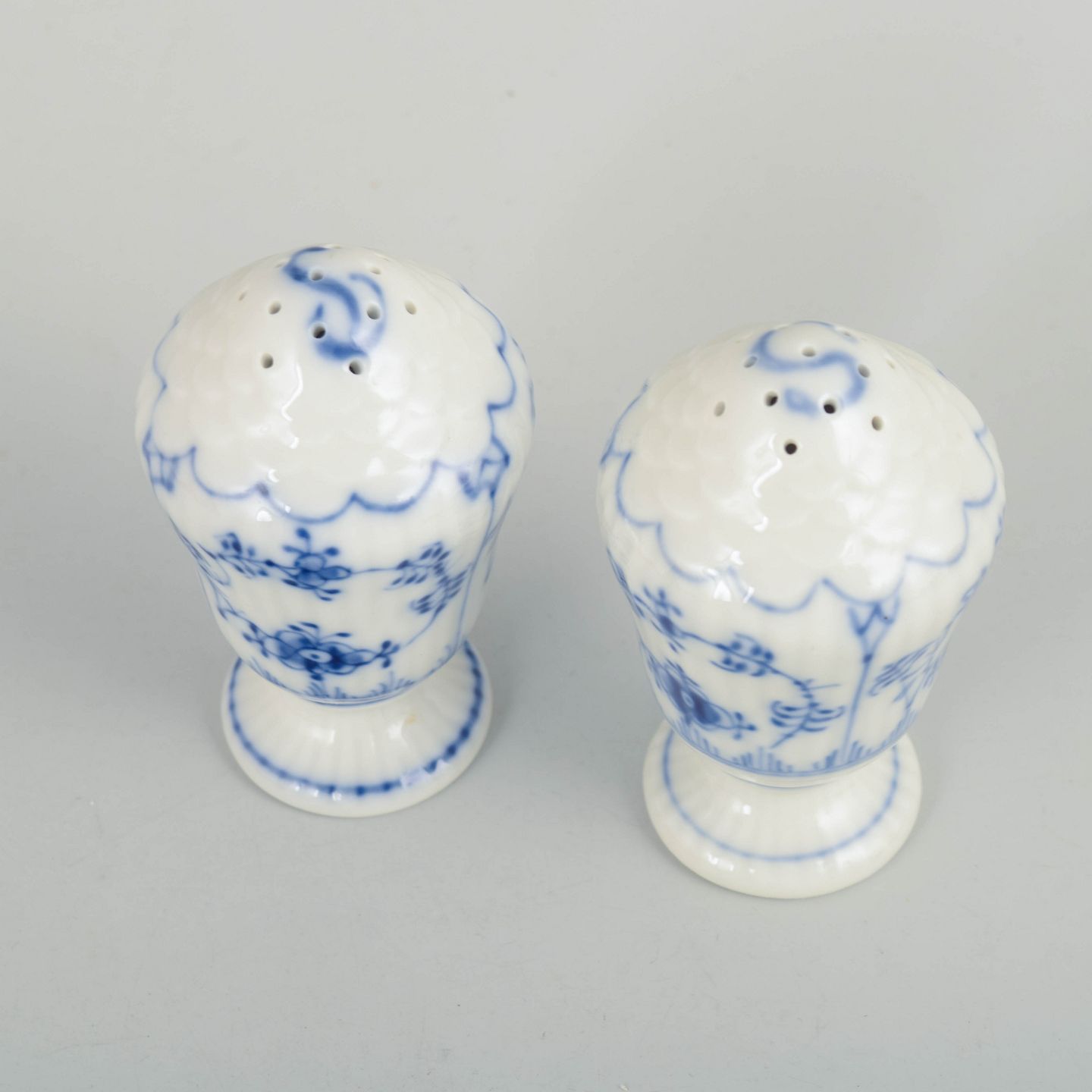 Royal Copenhagen Musselmalet Riflet, salt- og pebersæt.Salt- og pebersæt i håndmalet porcelæn fra Musselmalet Riflet med klassisk underglasurdekoration i koboltblå. Modeller 1/420 og 1/467. Første sortering. Fremstillet i 1920’erne.