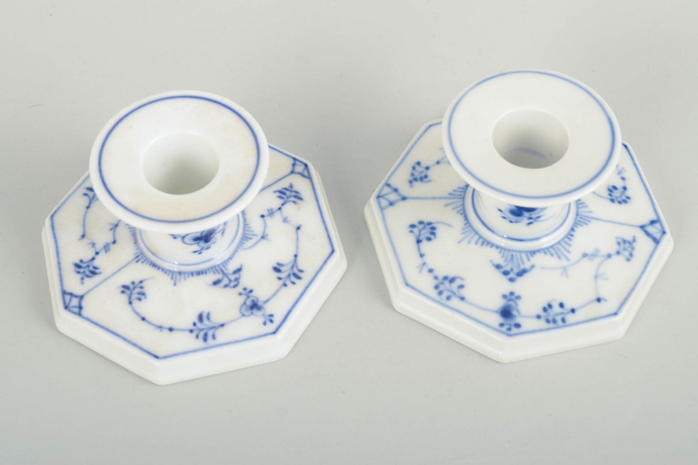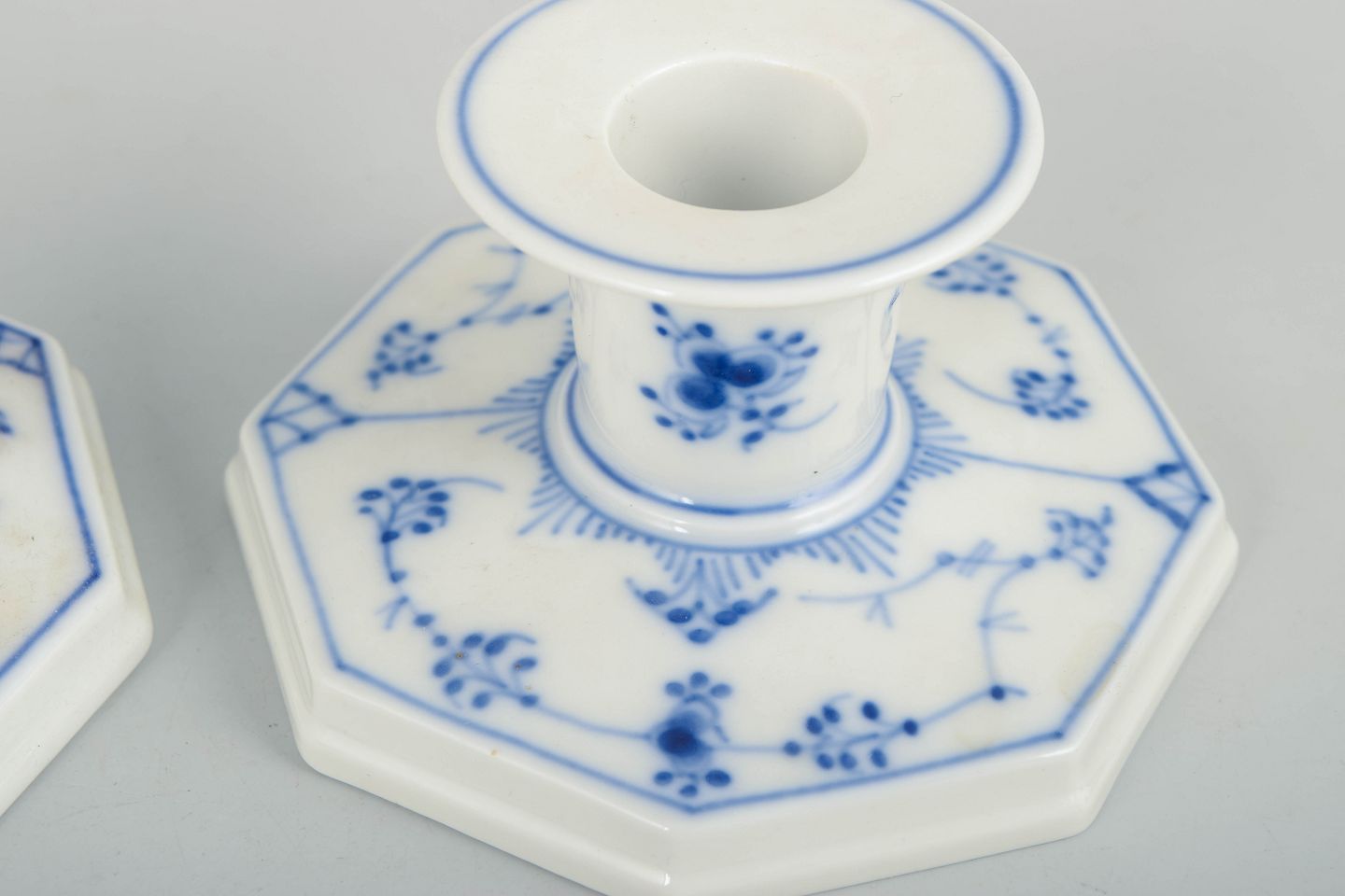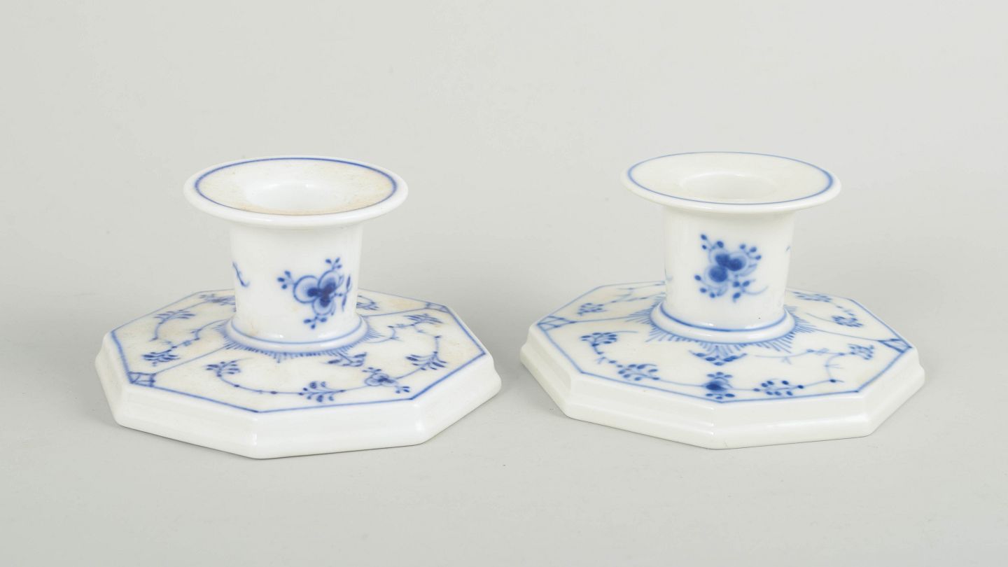 Royal Copenhagen Musselmalet Riflet, par lysestager.Par lysestager i håndmalet porcelæn fra Musselmalet Riflet med klassisk underglasurdekoration i koboltblå. Model 1/3334. Den ene er første sortering, den anden annulleret med én indridset streg under bunden. Fremstillet 1963.