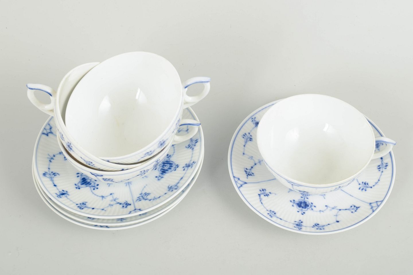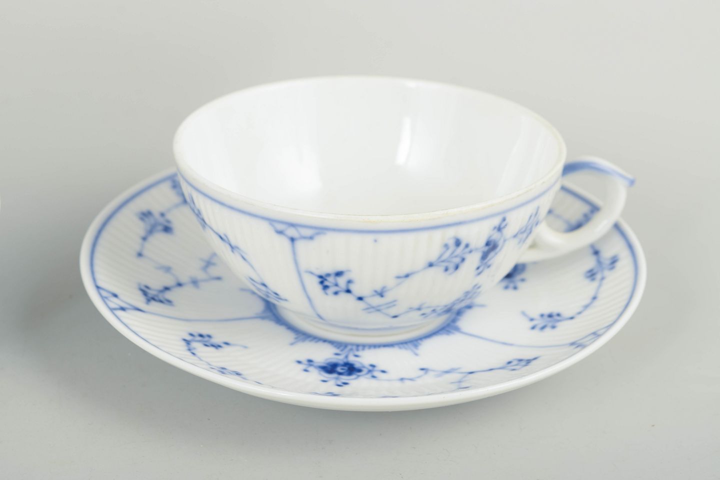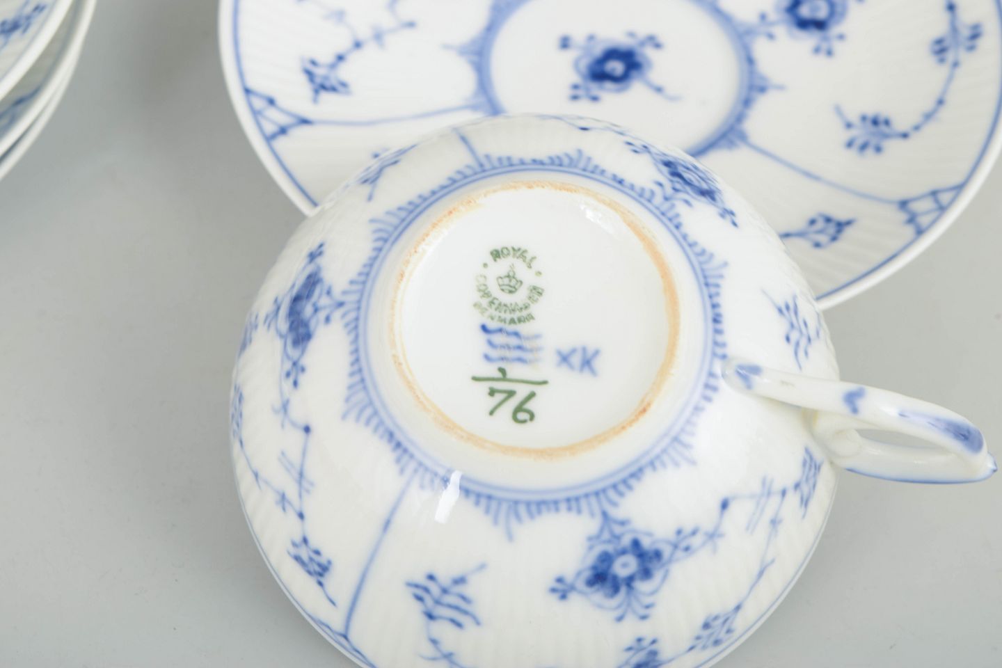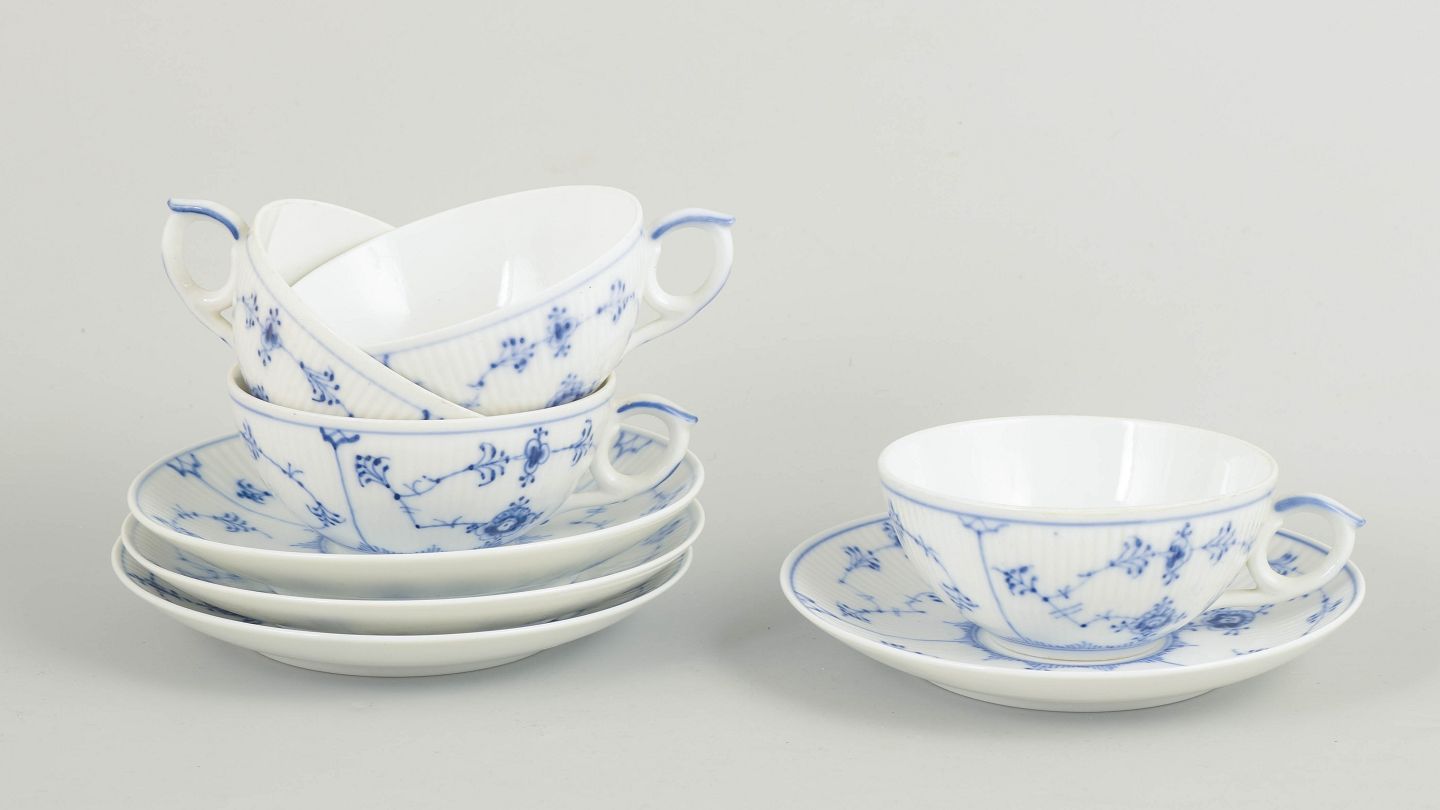 Royal Copenhagen Musselmalet Riflet, sæt af fire tekopper med tilhørende underkopper.Sæt af fire tekopper i håndmalet porcelæn fra Musselmalet Riflet med klassisk underglasurdekoration i koboltblå. Model 1/76. Nogle dele er første sortering, andre annulleret med én eller to indridsede streger under bunden.