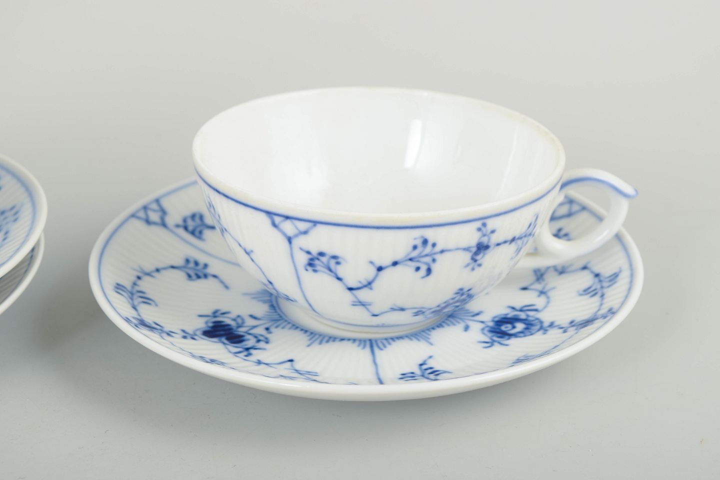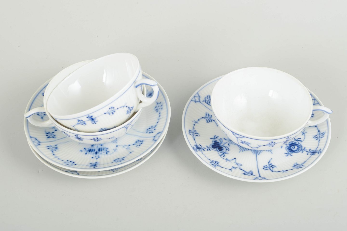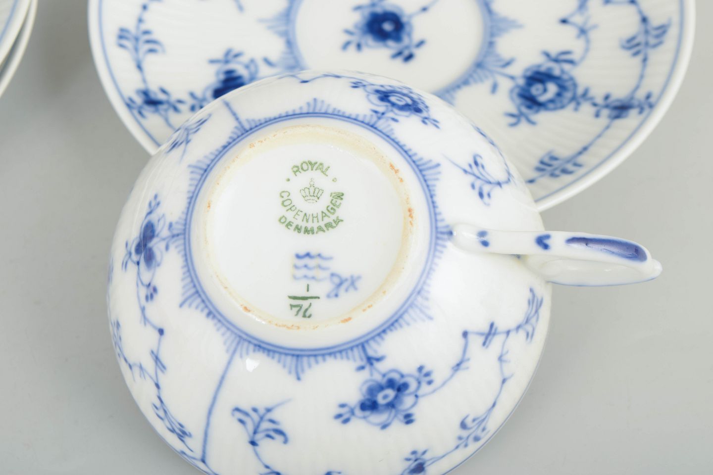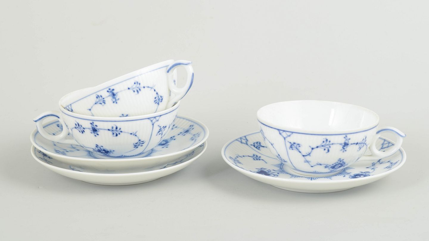 Royal Copenhagen Musselmalet Riflet, sæt af tre tekopper med tilhørende underkopper.Sæt af tre tekopper i håndmalet porcelæn fra Musselmalet Riflet med klassisk underglasurdekoration i koboltblå. Model 1/76. Fremstillet i 1920’erne. Nogle dele er første sortering, andre annulleret med én eller to indridsede streger under bunden.
