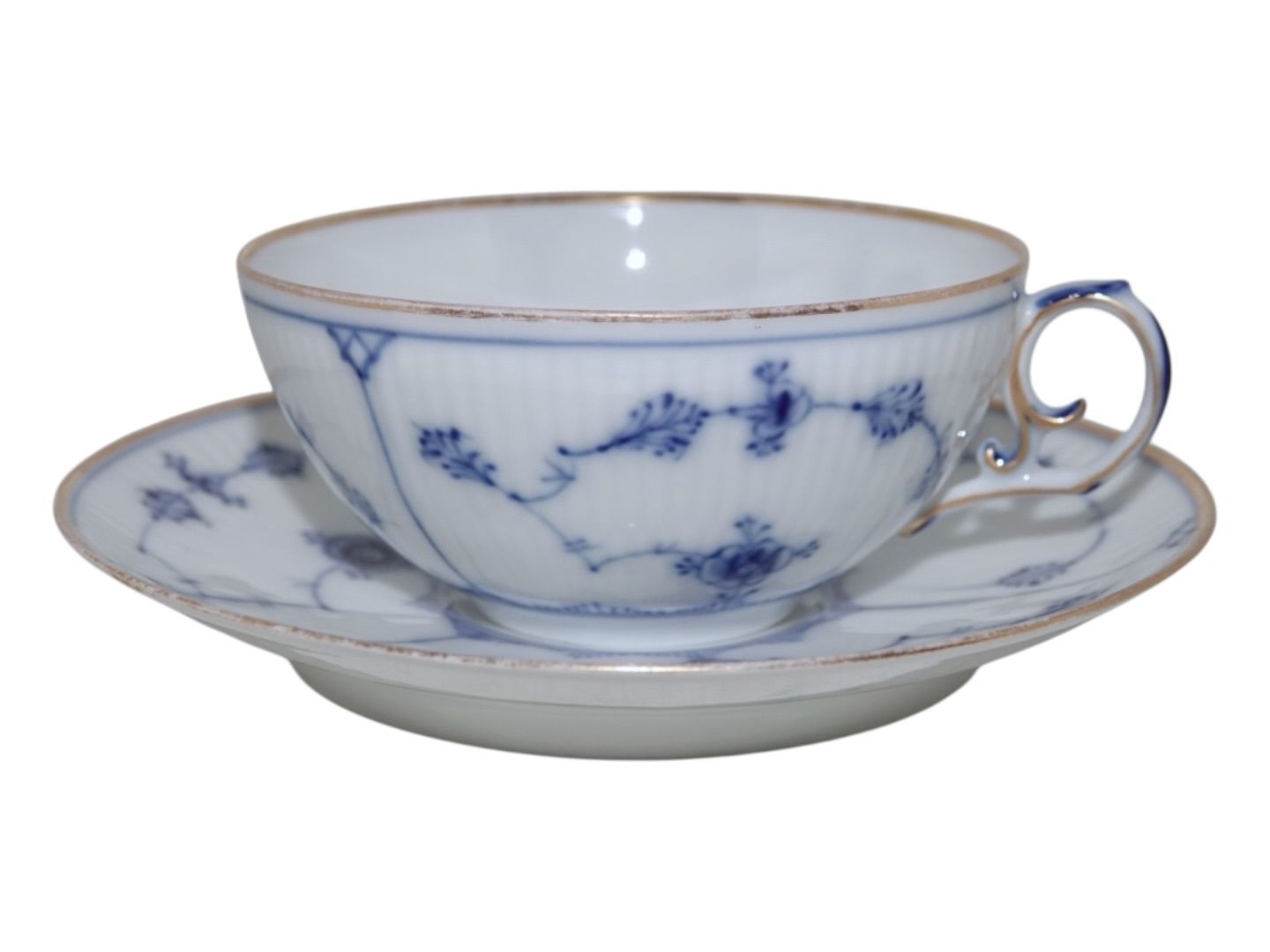 Royal Copenhagen Musselmalet Riflet med guldkant, tekop der er tynd i porcelænet.Kopperne er uden dekorationsnummer og underkopperne har nummer 1/92.