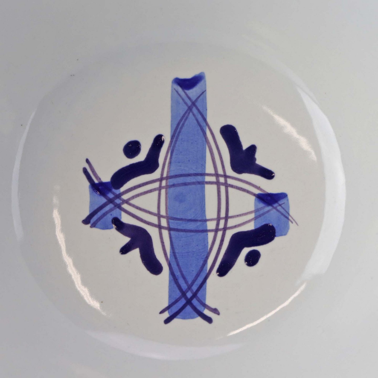 Fajancestel i stelform CA med dekoration af abstrakt motiv i blå og lyseblå på en råhvid baggrund.