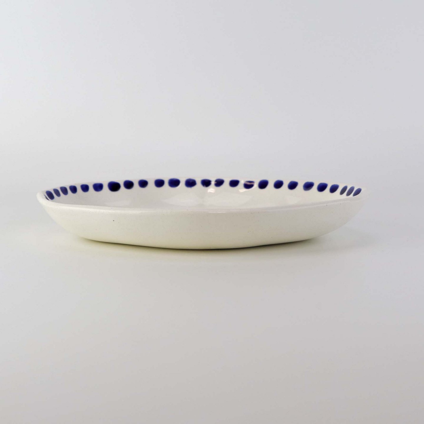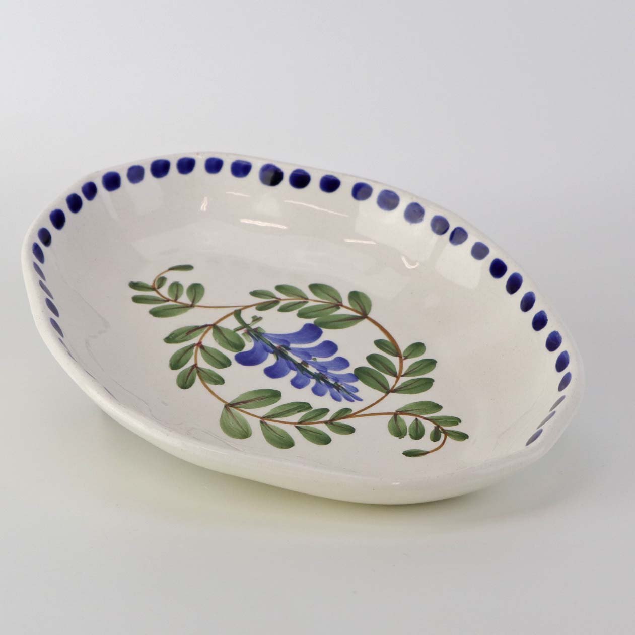 Lille ovalt fad med bølget form i fajance fra stellet Blåregn. Stellet er fremstillet i perioden år 1903-1933. Nr. 522/354Formgiver Christian Joachim