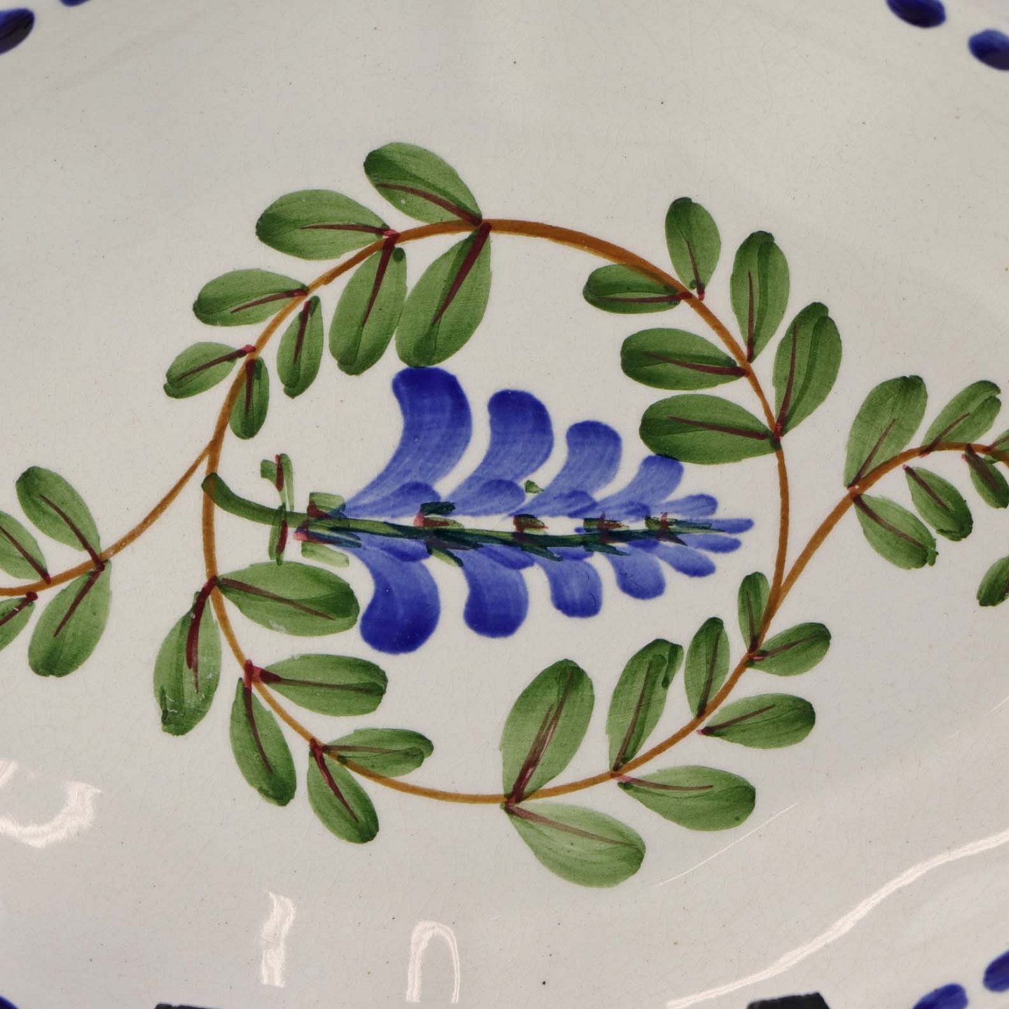 Fajancestel med dekoration af ranker af blåregn og blade på lys baggrund afsluttet med kant af runde blå pletter.