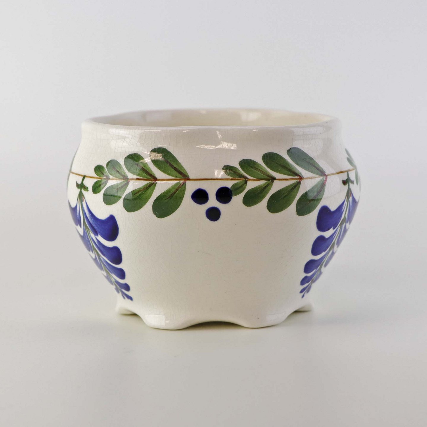 Fajancestel med dekoration af ranker af blåregn og blade på lys baggrund afsluttet med kant af runde blå pletter.
