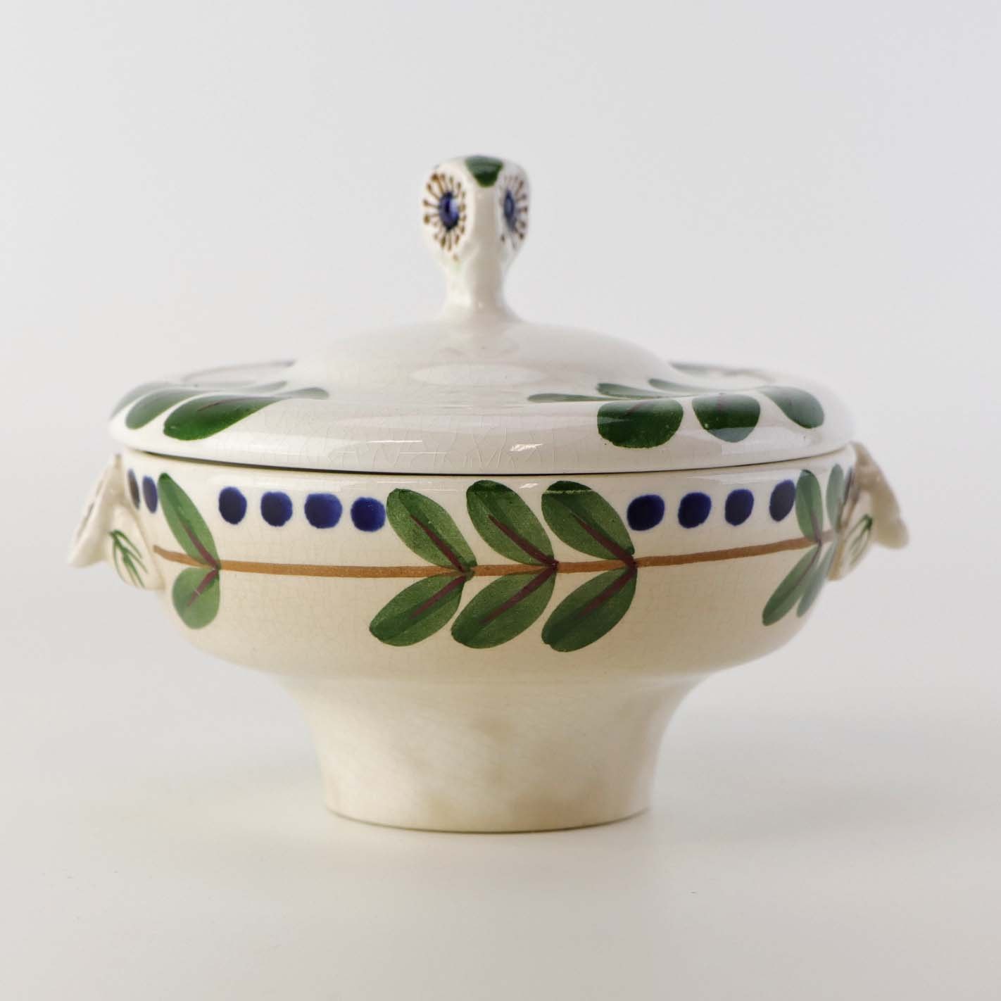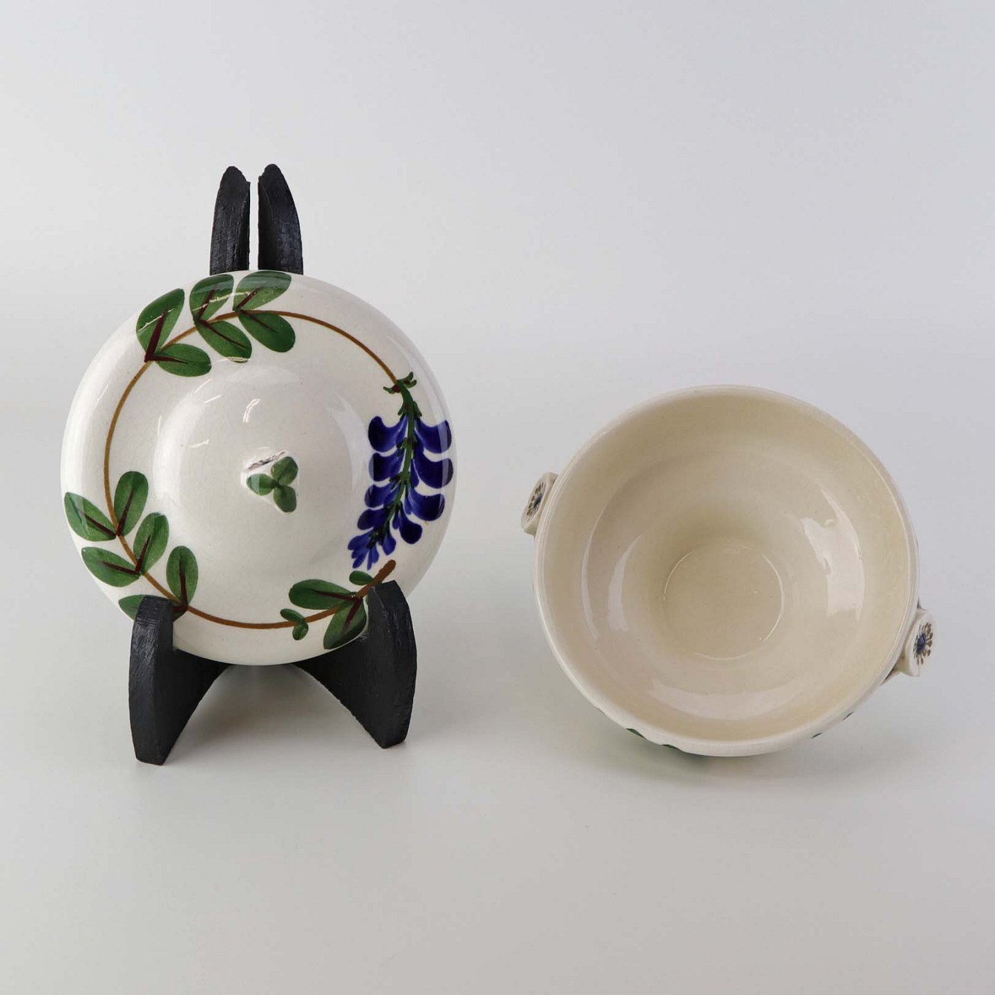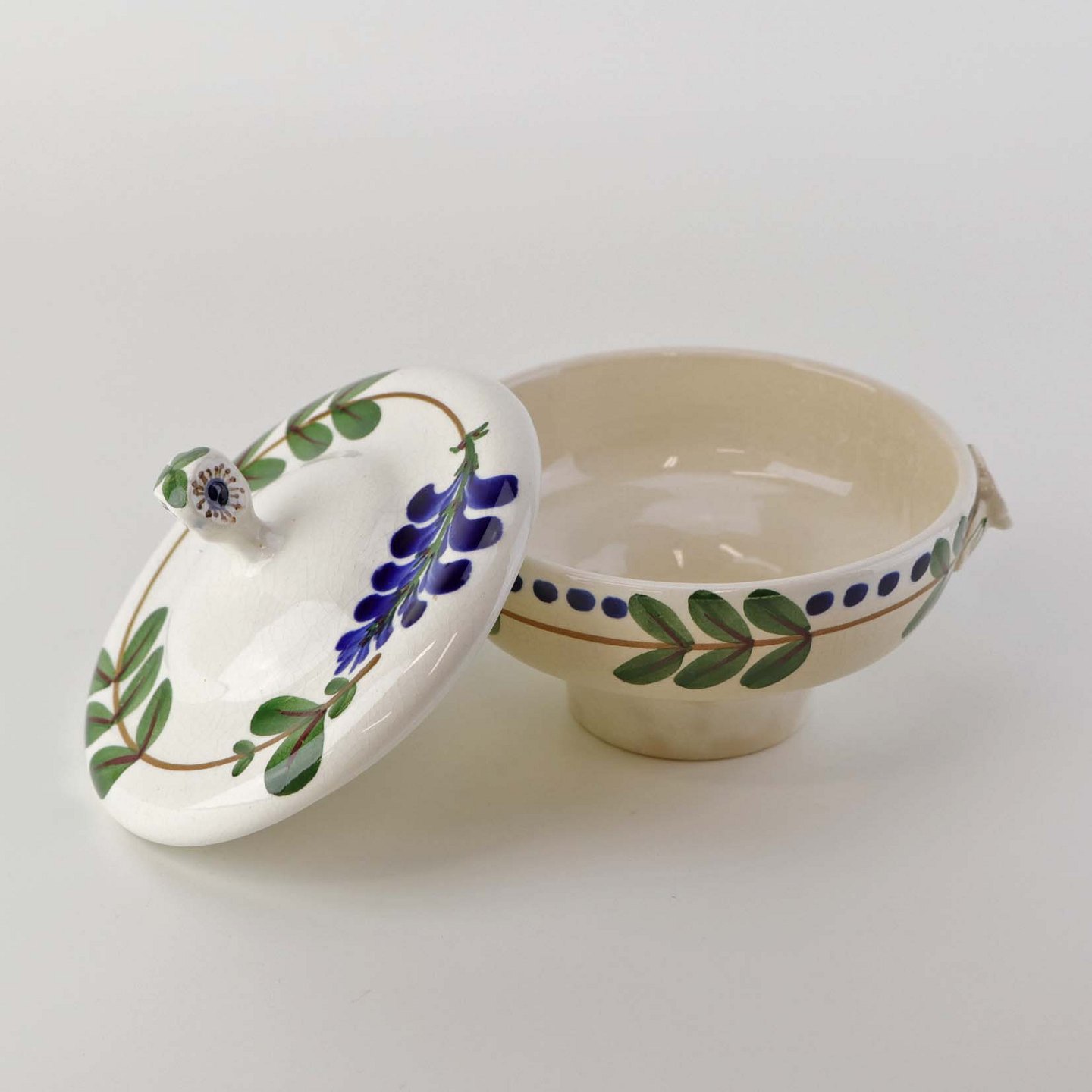 Fajancestel med dekoration af ranker af blåregn og blade på lys baggrund afsluttet med kant af runde blå pletter.