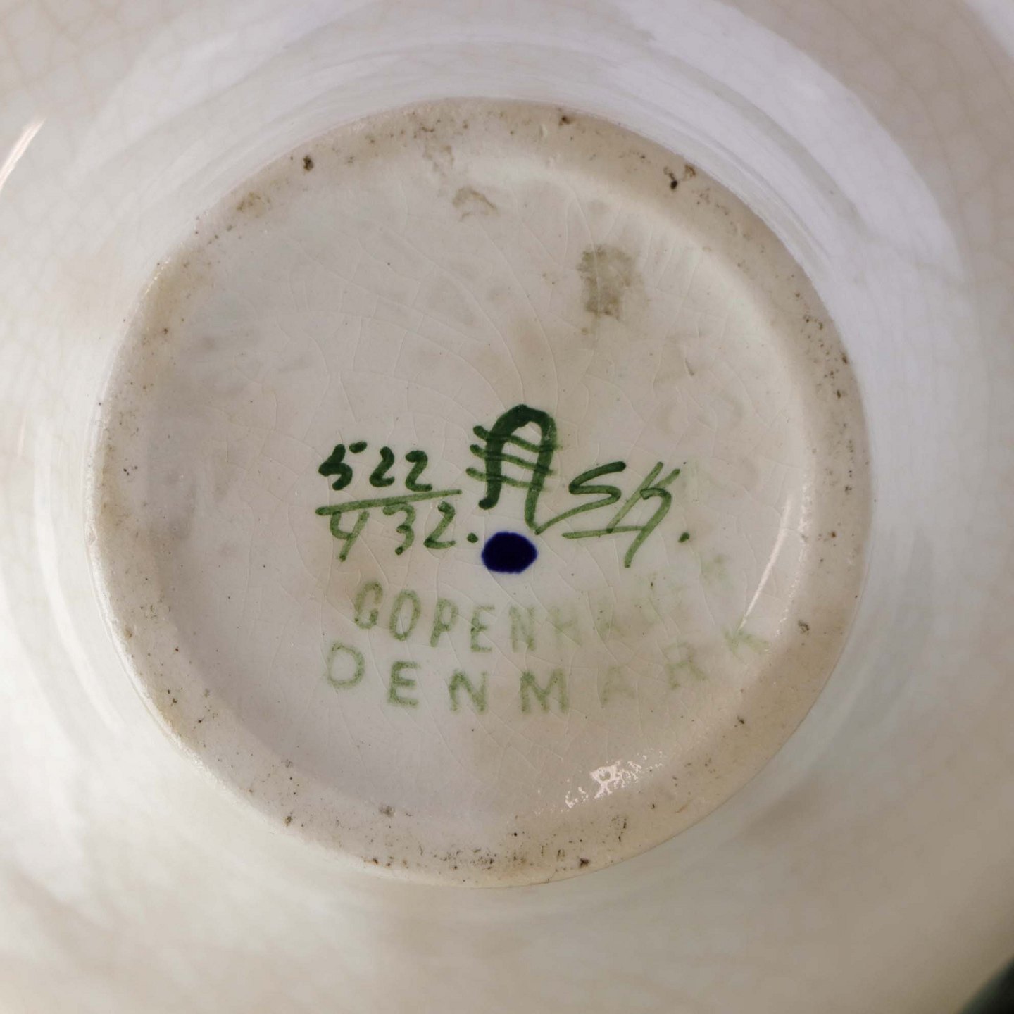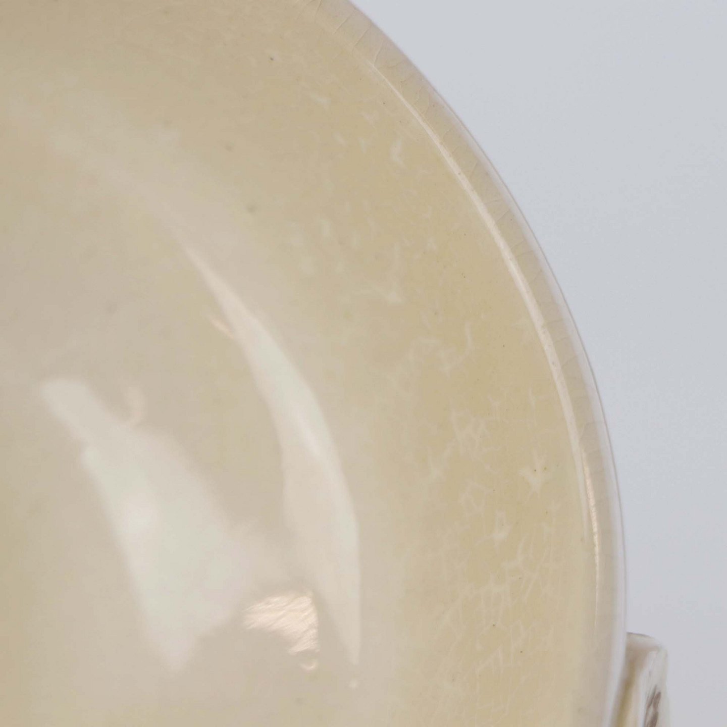 Fremstår med krakkeleringer i glasuren, samt lys brunering under glasuren på krukkens inderside.