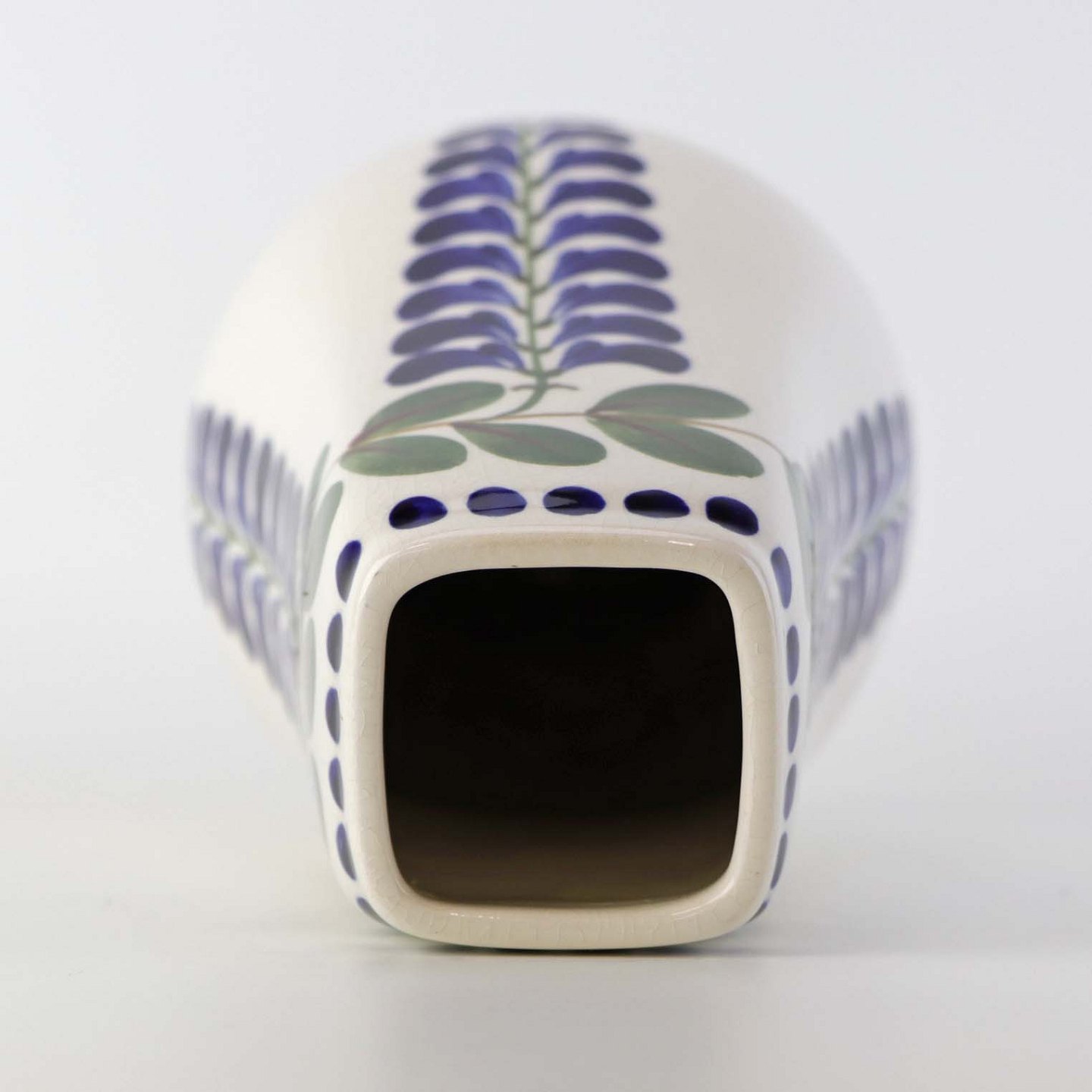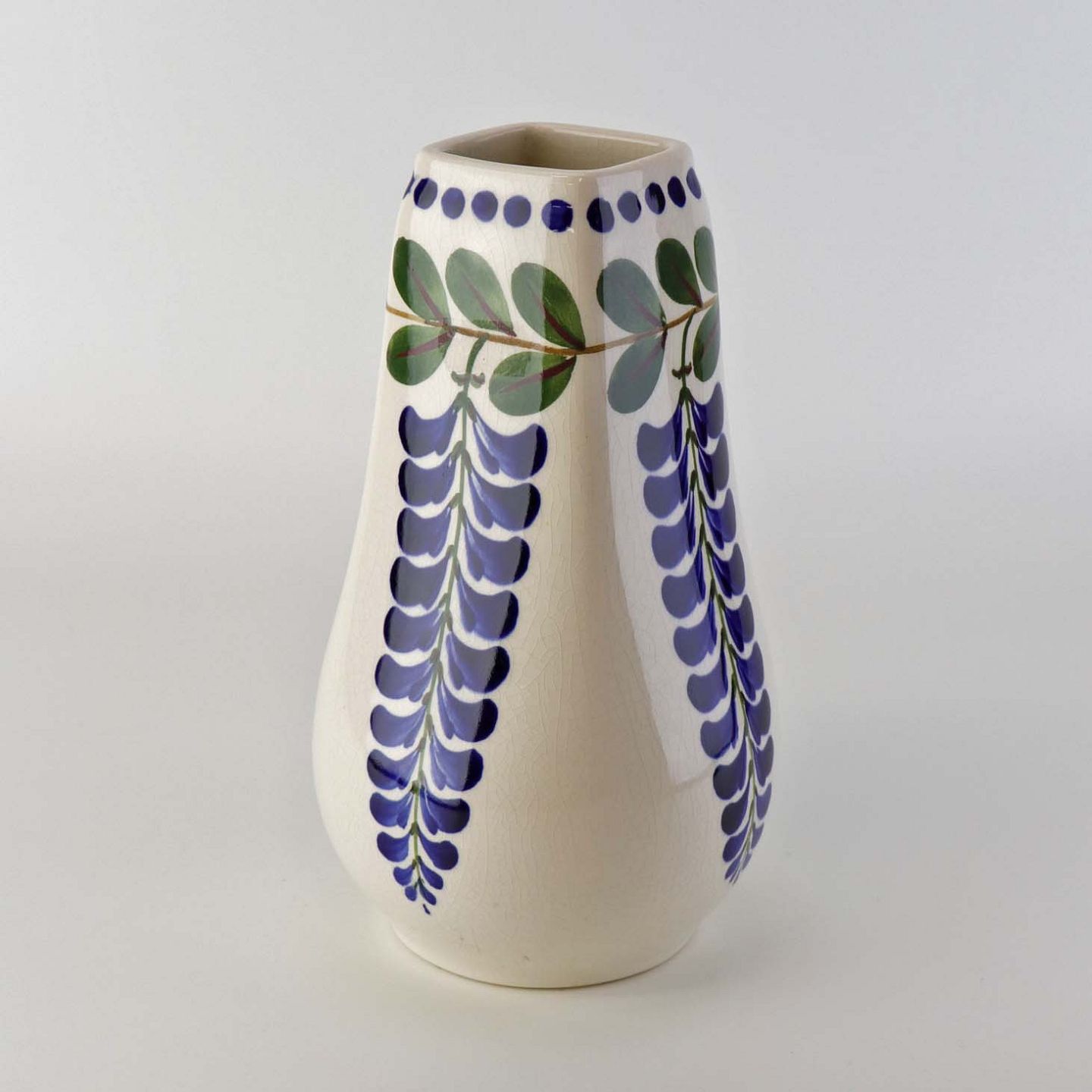 Høj vase i fajance med kantet hals fra stellet Blåregn. Stellet er fremstillet i perioden år 1903-1933. Nr. 522/110Formgiver Christian Joachim
