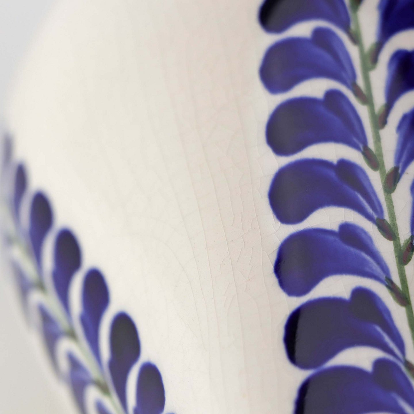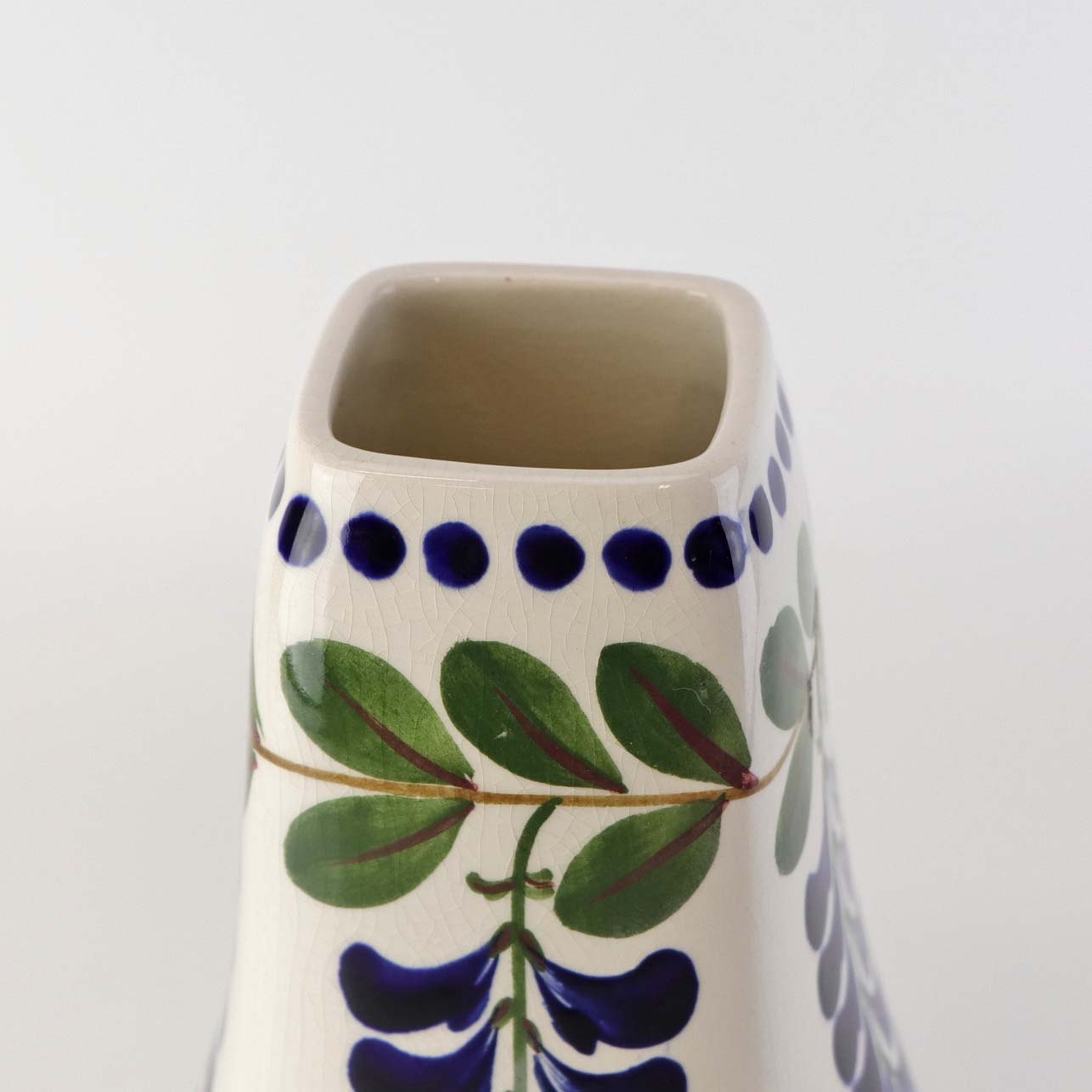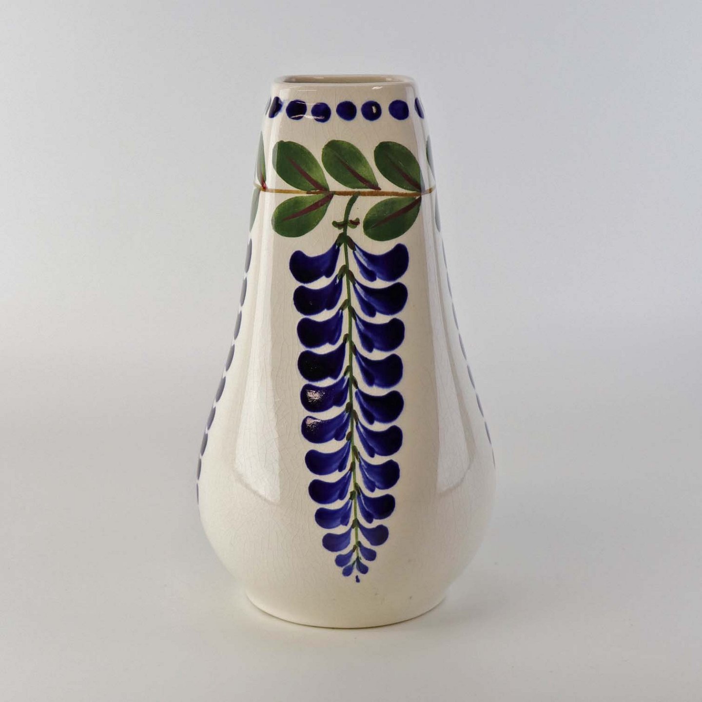 Fajancestel med dekoration af ranker af blåregn og blade på lys baggrund afsluttet med kant af runde blå pletter.