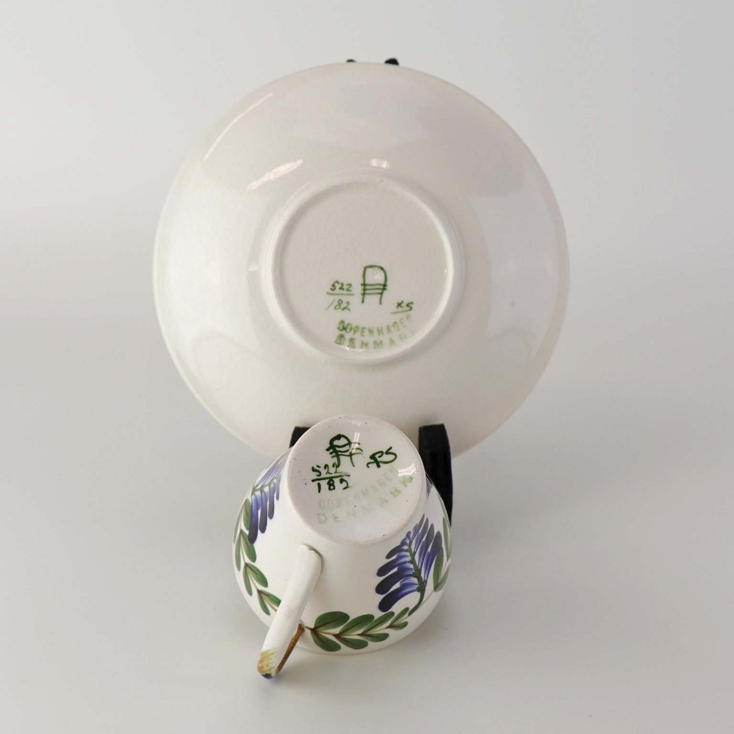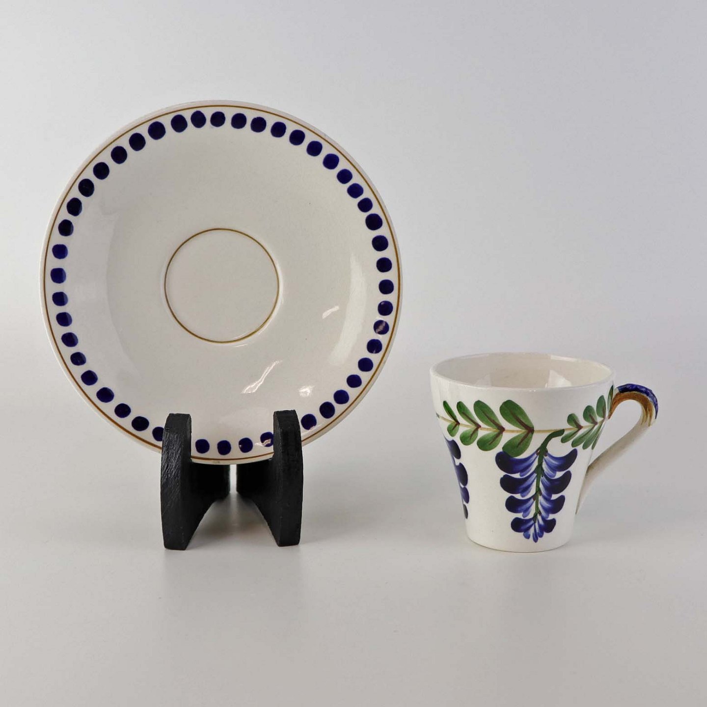 Lille kaffe eller moccakop med underkop i fajance fra stellet Blåregn. Stellet er fremstillet i perioden år 1903-1933. Nr. 522/182Formgiver Christian Joachim