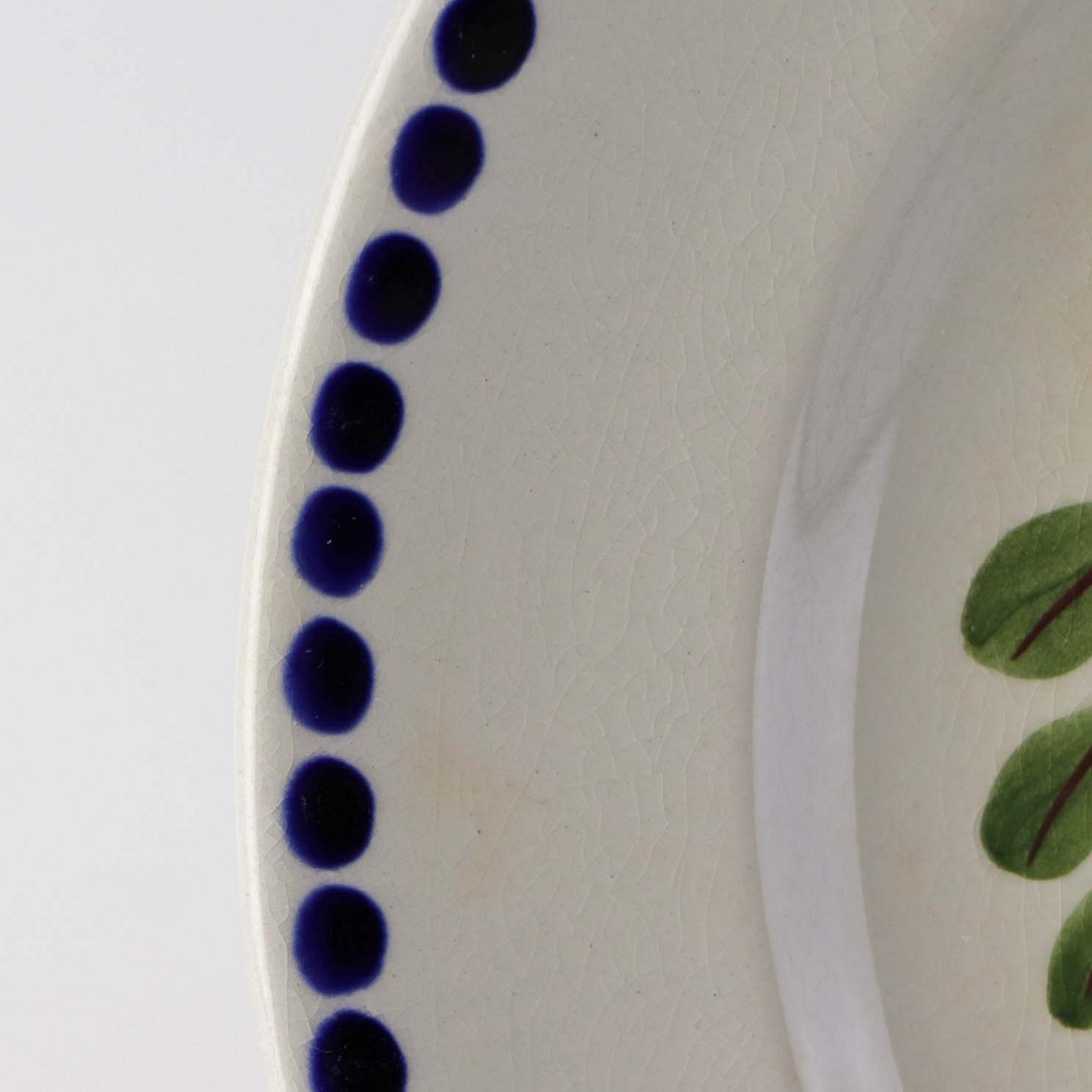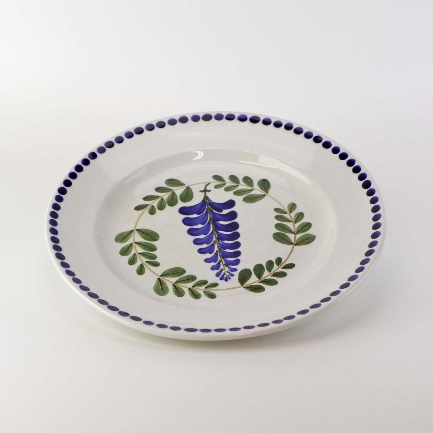 Fajancestel med dekoration af ranker af blåregn og blade på lys baggrund afsluttet med kant af runde blå pletter.