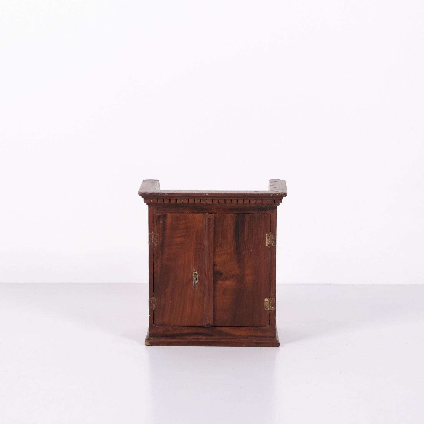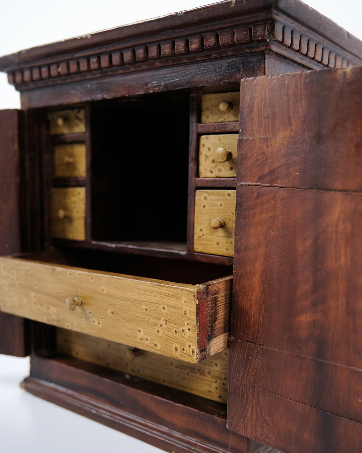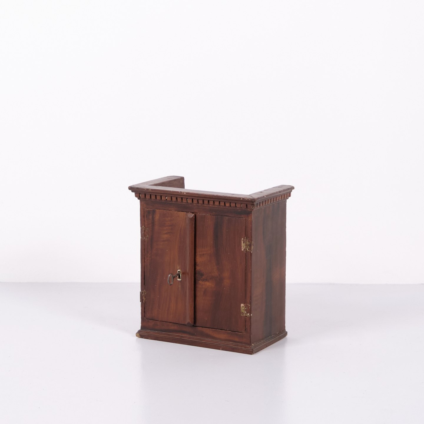 Antikt miniaturemøbel i åremålet fyrretræ med håndsmedede beslag fra 1840’erne. Unikt og dekorativt samlerobjekt med historisk karakter.— Oprindelse: Europa