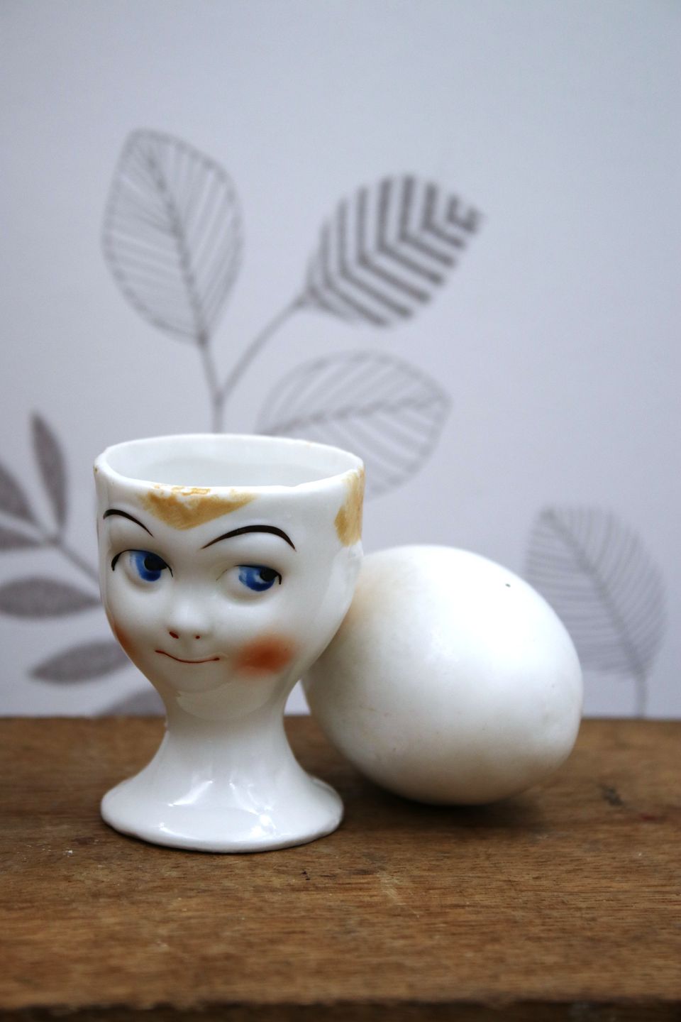 Gammelt æggebægre fra 30érne i porcelæn med bemalet sjovt ansigt.Højde: 6cm.