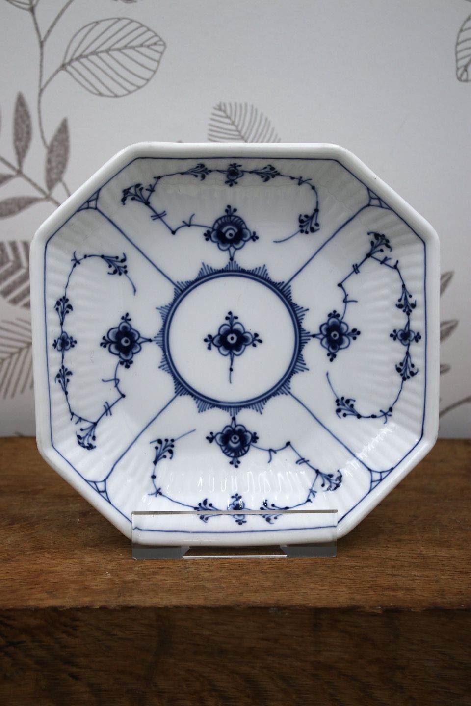 8 kantet sættefad i Musselmalet Riflet fra Royal Copenhagen. Dekorationsnummer: 1/230. 14,5x14,5cm. 1.sort. fra 1898-1923.(2 stk. haves på lager)
