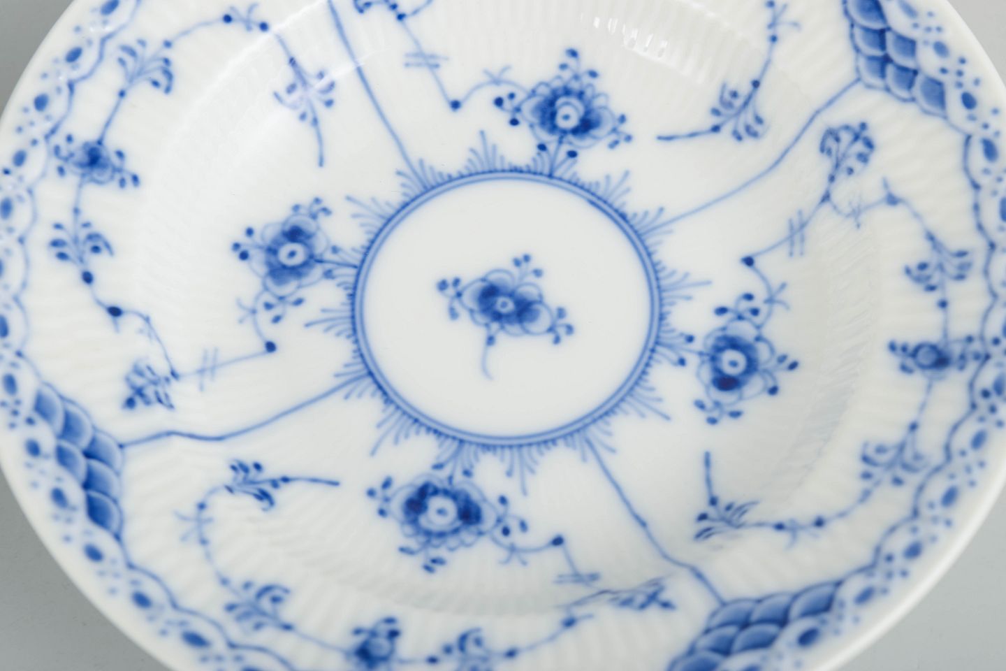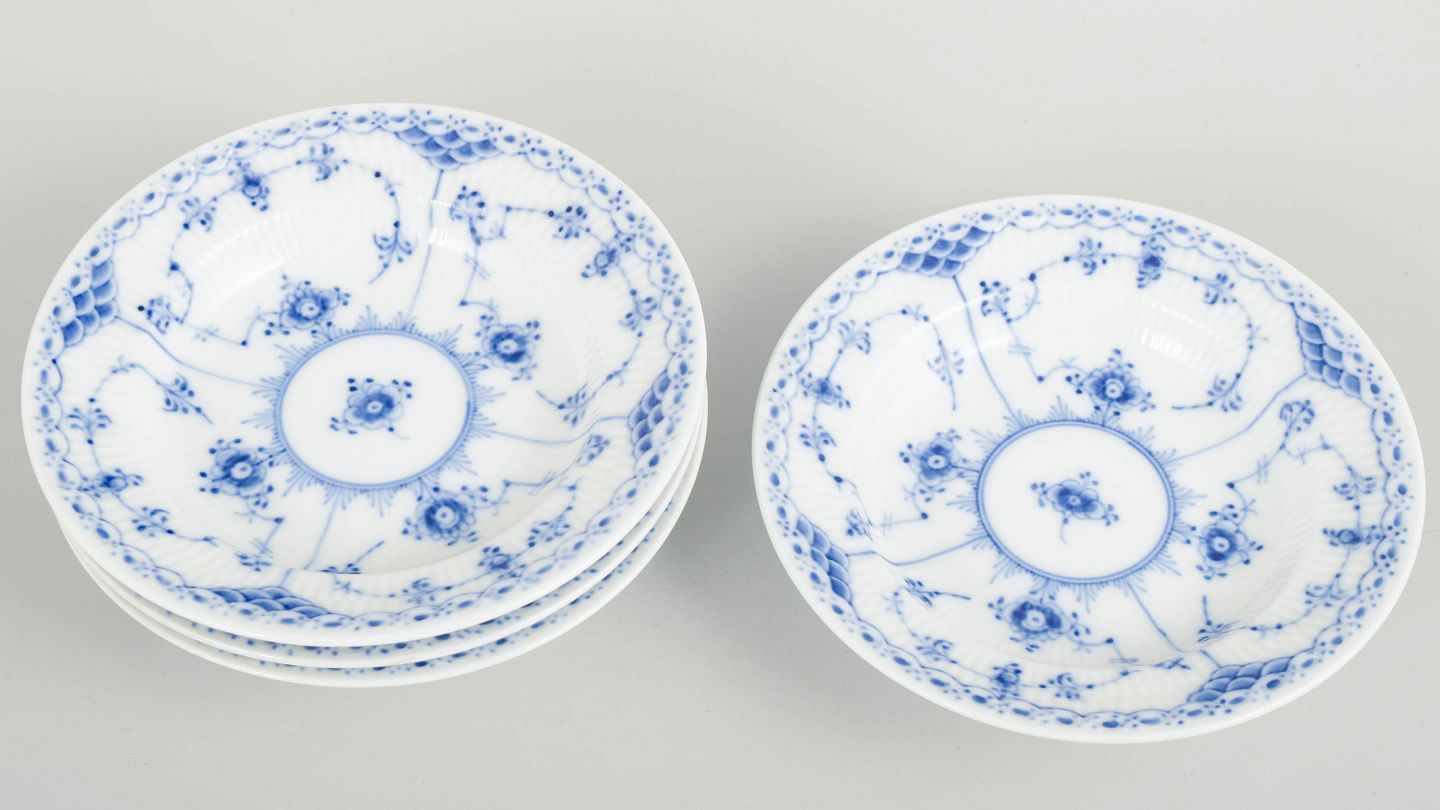 Royal Copenhagen Musselmalet Halvblonde, sæt af fire små dybe tallerkener.Sæt af fire små dybe morgenmadstallerkener i håndmalet porcelæn fra Musselmalet Halvblonde med klassisk underglasurdekoration i koboltblå, riflede felter og karakteristisk blondekant. Model 1/569. Første sortering. Fremstillet 1963.