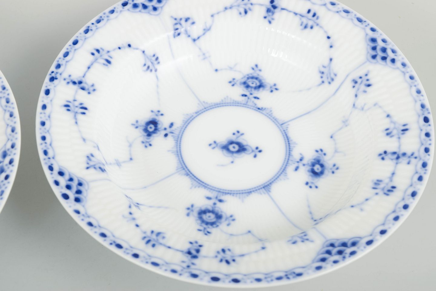 Royal Copenhagen Musselmalet Halvblonde, sæt af to dybe tallerkener.Sæt af to dybe tallerkener i håndmalet porcelæn fra Musselmalet Halvblonde med klassisk underglasurdekoration i koboltblå, riflede felter og karakteristisk blondekant.