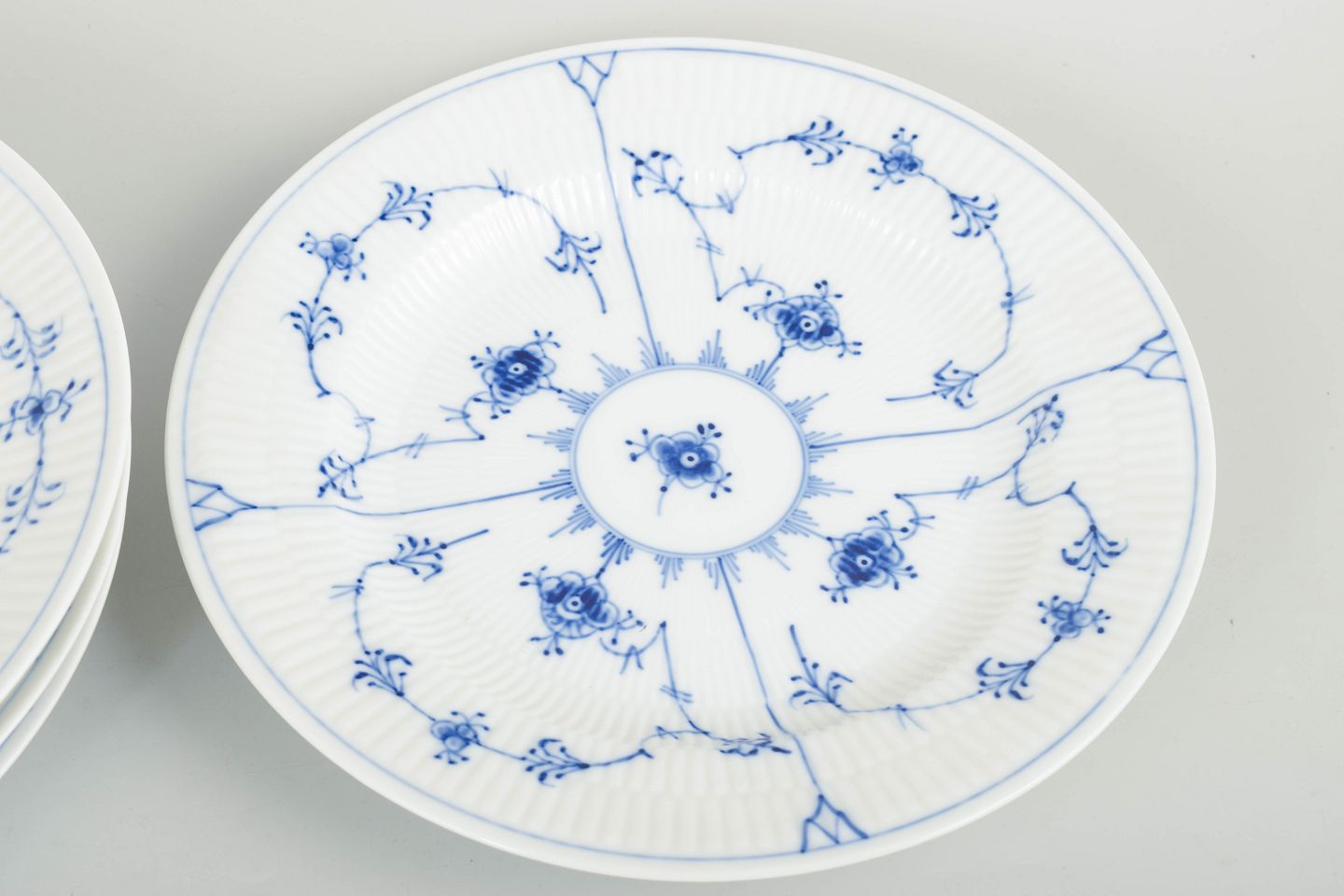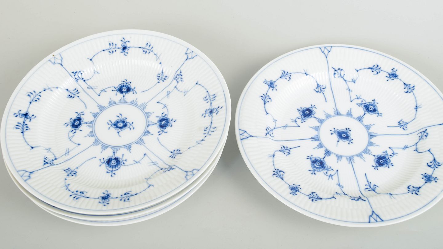 Royal Copenhagen Musselmalet Riflet, sæt af fire middagstallerkener.Sæt af fire middagstallerkener i håndmalet porcelæn fra Musselmalet Riflet med klassisk underglasurdekoration i koboltblå. Model 1/175. Første sortering. Hver tallerken måler 26 cm i diameter. Fremstillet 1967.