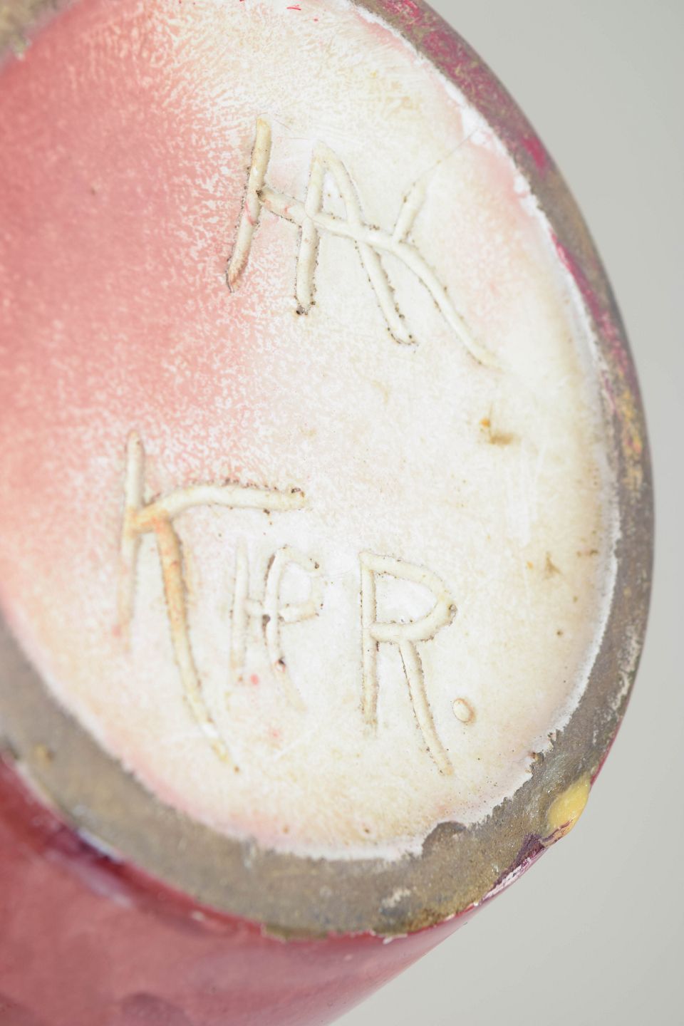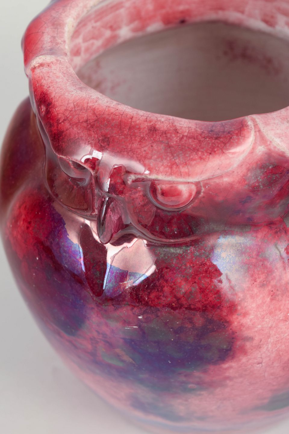 Karl Hansen Reistrup for Kähler, uglevase. Lustreglasur.Unika uglevase i kunstkeramik med ugledekoration langs randen i relief og iriserende glasur i røde og blå nuancer. Fremstillet hos Kähler i 1890’erne under Karl Hansen Reistrups kunstneriske ledelse fra 1888.
