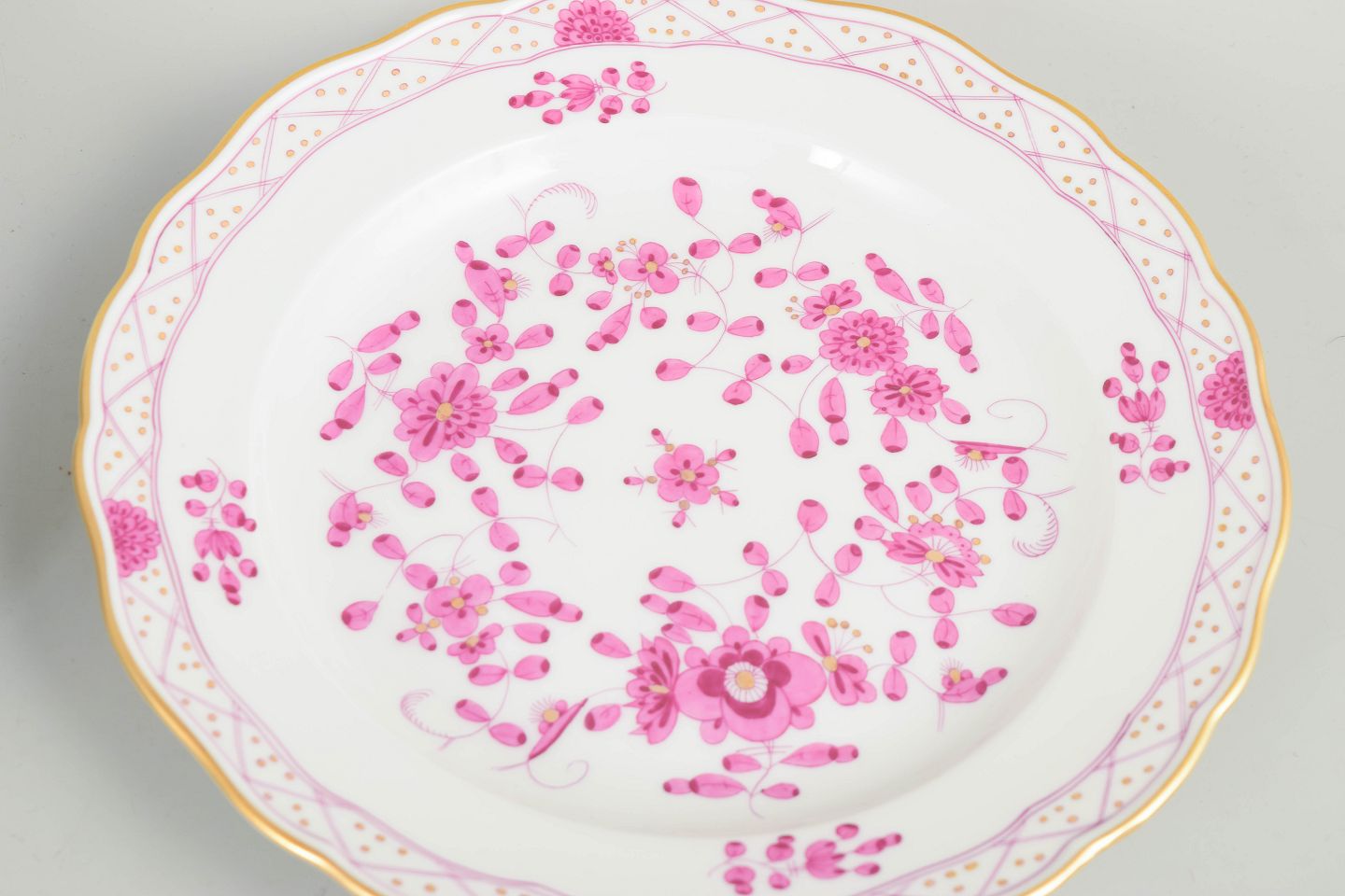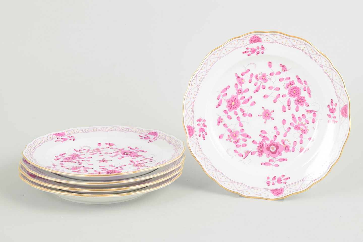 Meissen, "Pink Indian" sæt af fem frokosttallerkener.Sæt af fem salattallerkener i håndmalet porcelæn med blomsterdekoration i rosa nuancer og forgyldt kant.