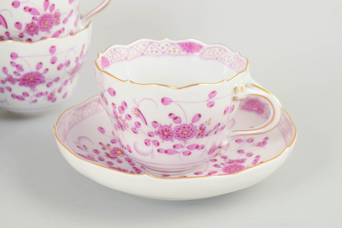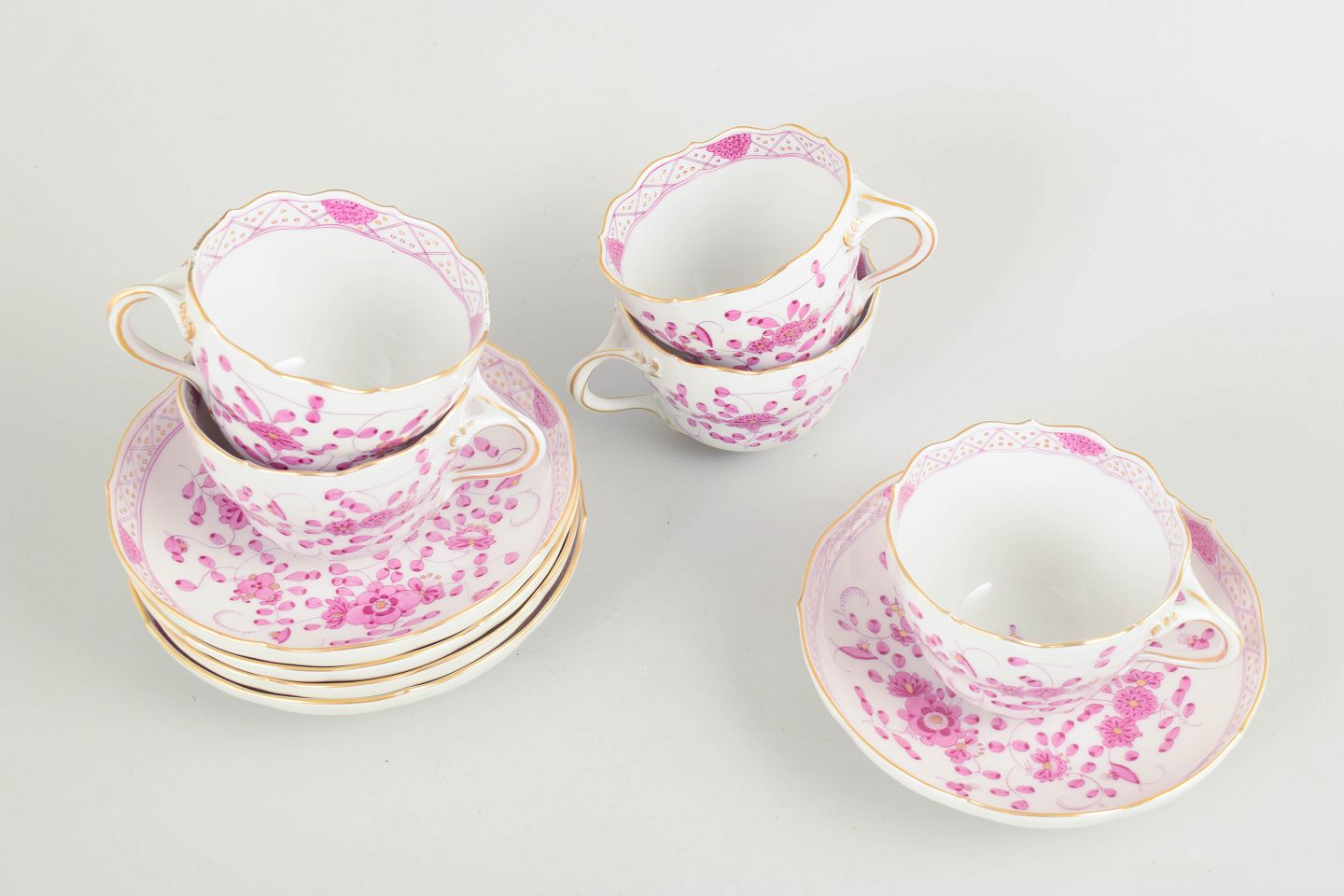 Meissen, "Pink Indian" sæt af fem store kaffekopper med underkopper.