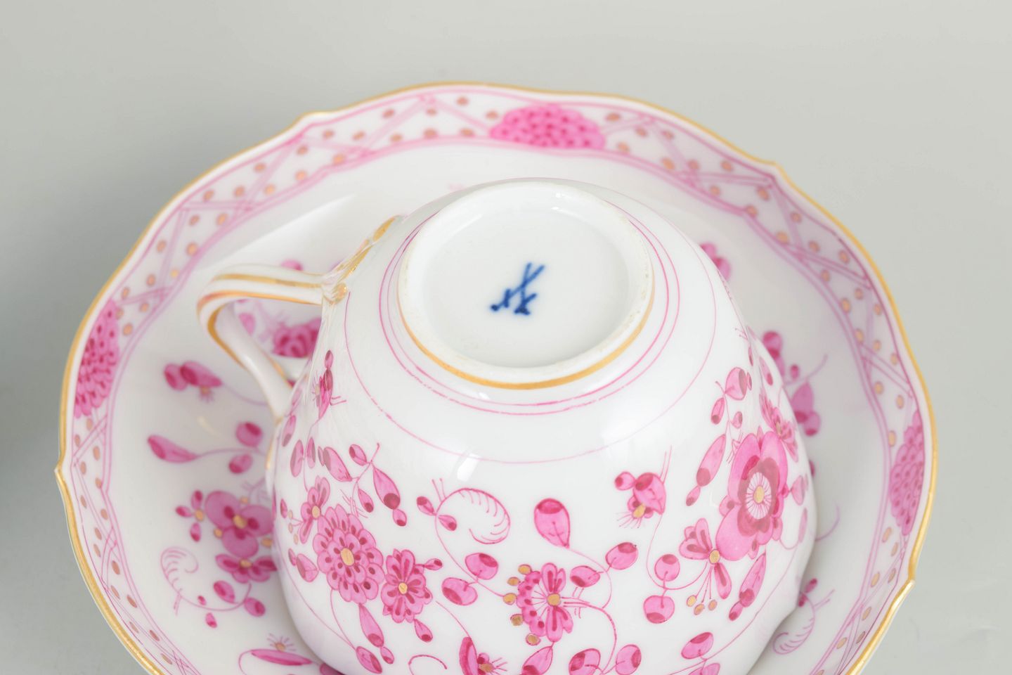 Meissen, "Pink Indian" sæt af tre store kaffekopper med underkopper.Sæt af tre store kaffekopper med tilhørende underkopper i håndmalet porcelæn med blomsterdekoration i rosa nuancer og forgyldte detaljer.