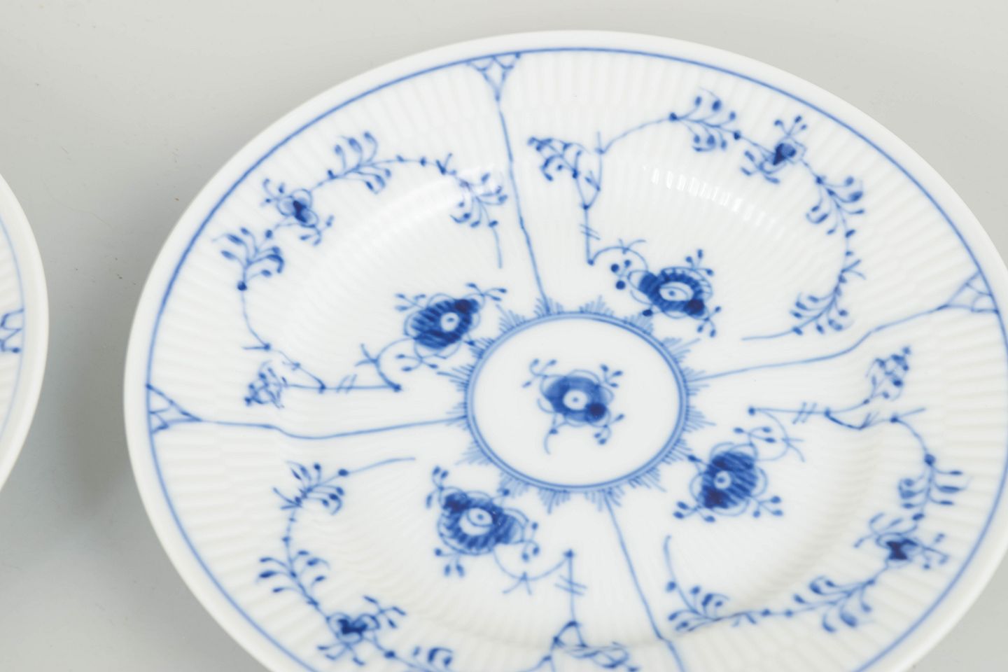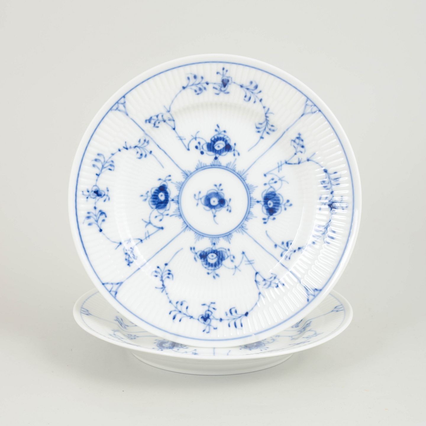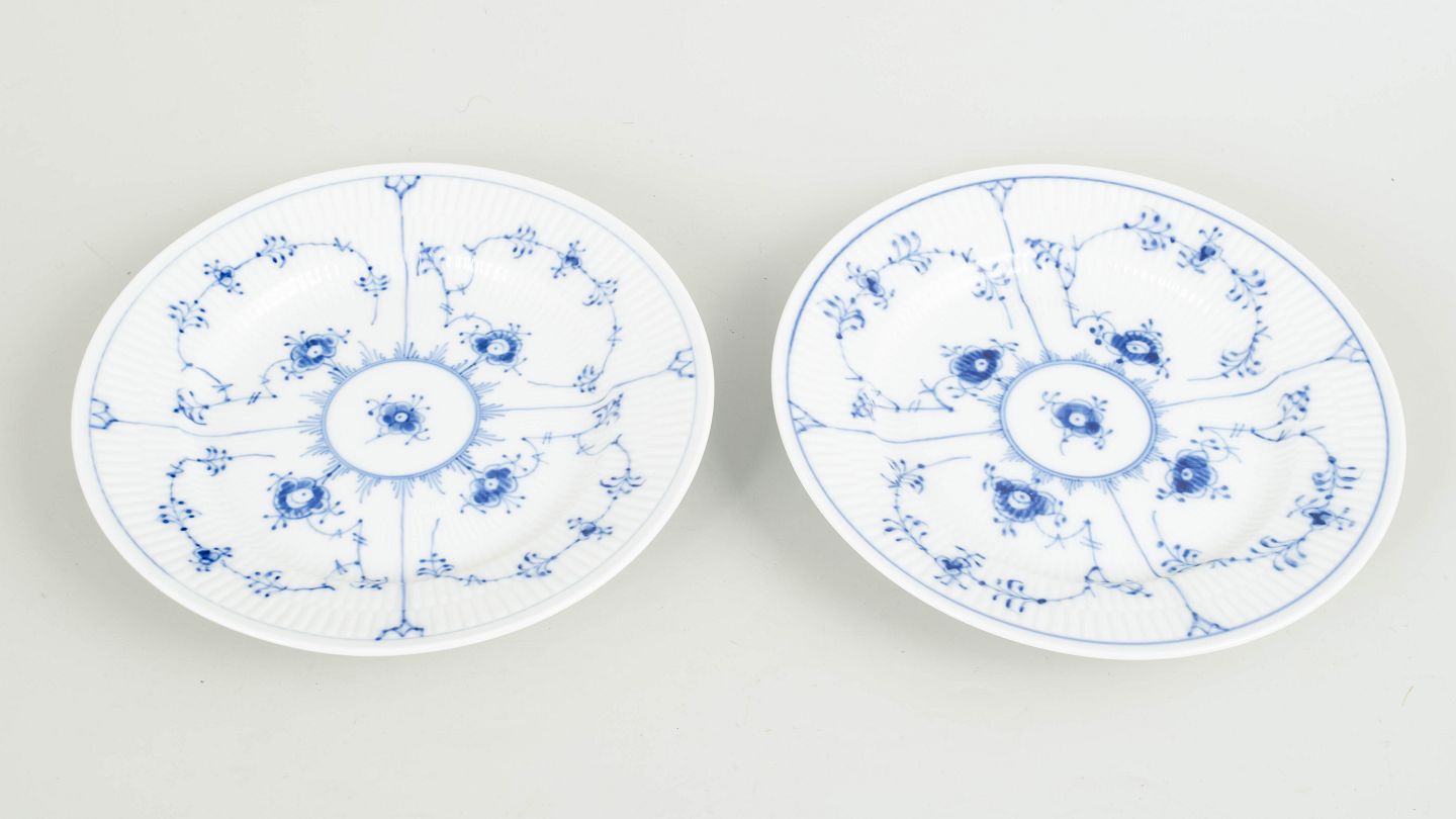 Royal Copenhagen Musselmalet Riflet to tallerkener.To salattallerkener i håndmalet porcelæn fra Musselmalet Riflet med klassisk underglasurdekoration i koboltblå. Model 1/179. Første sortering. Tallerkenerne måler D. 19 cm. Fremstillet i 1980’erne.