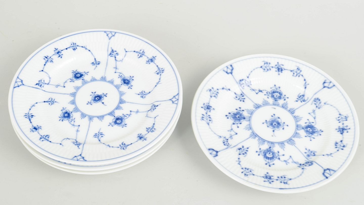 Royal Copenhagen Musselmalet Riflet, sæt af fire kagetallerkener.Sæt af fire kagetallerkener i håndmalet porcelæn fra Musselmalet Riflet med klassisk underglasurdekoration i koboltblå. Model 1/180. Første sortering. Tallerkenerne måler D. 17 cm. Fremstillet i 1970’erne.