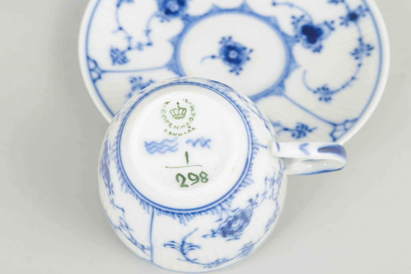 Royal Copenhagen Musselmalet Riflet, sæt af fire mokkakopper med underkopper.Sæt af fire mokkakopper med tilhørende underkopper i håndmalet porcelæn fra Musselmalet Riflet med klassisk underglasurdekoration i koboltblå.