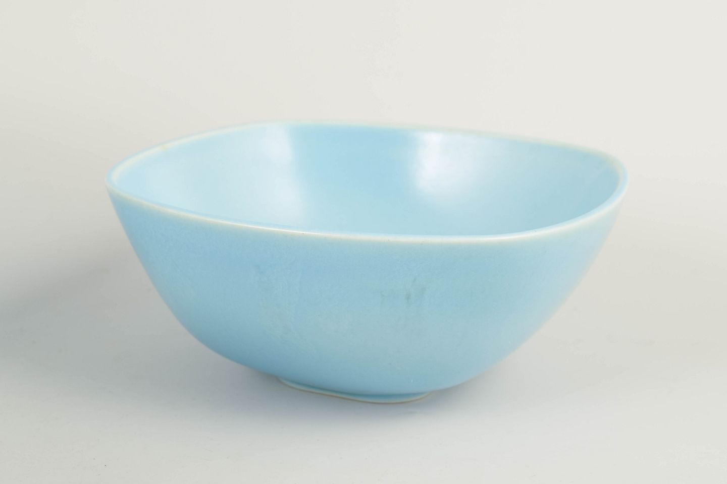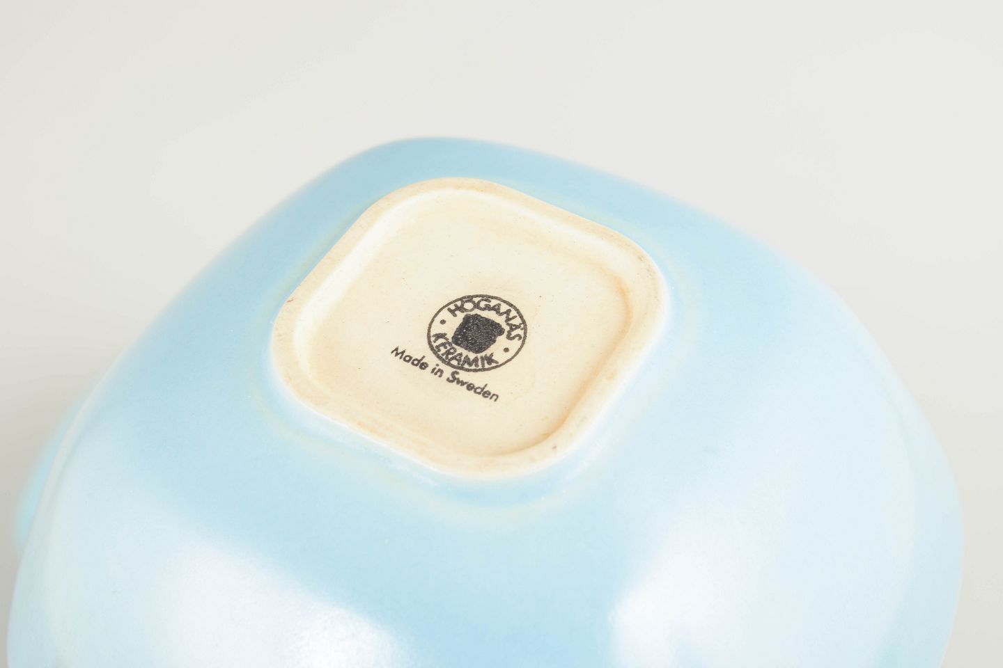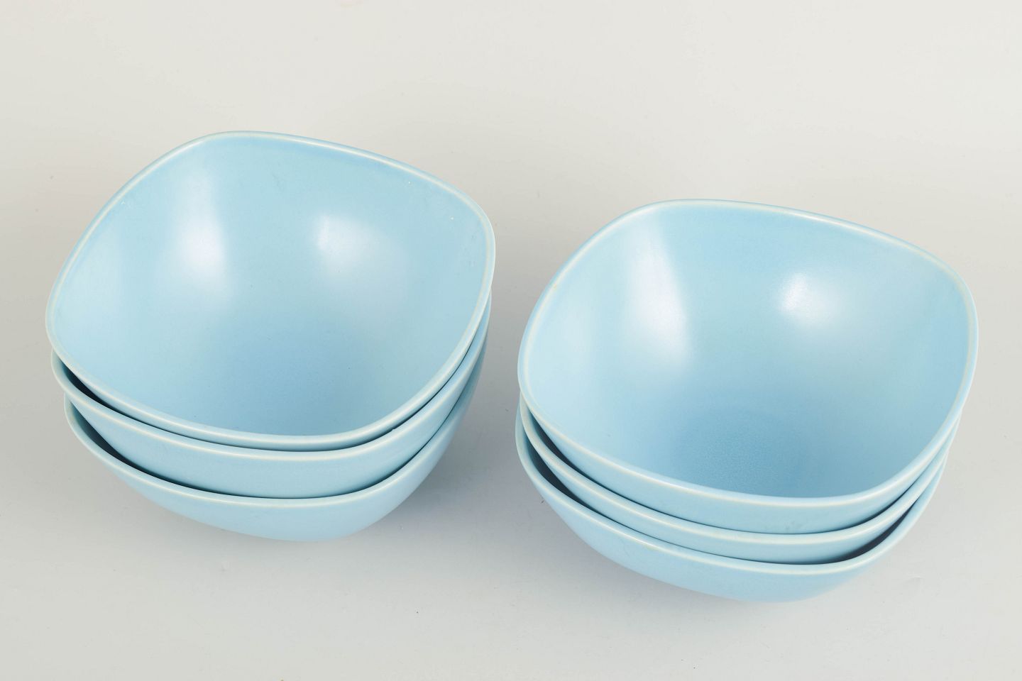 Höganäs Keramik, sæt af seks skåle.Sæt af seks skåle i stentøj med lyseblå glasur og enkle funktionelle former. Stemplet Höganäs Keramik, Made in Sweden.