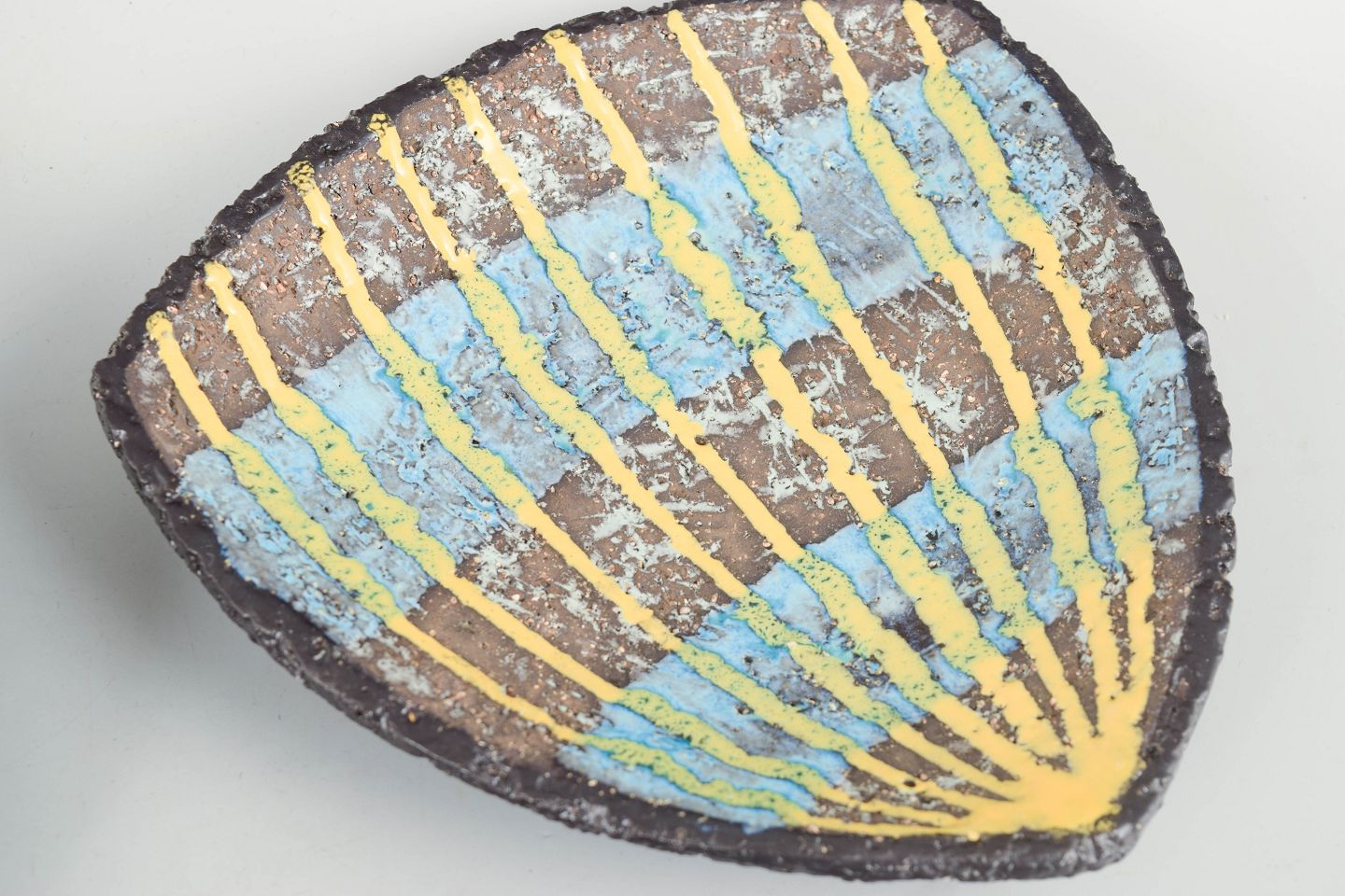 Ingrid Atterberg for Upsala Ekeby, to fade.To mindre ovale keramikfade model 2548, udført i stentøj med reliefdekoration og flerfarvet glasur i blå og gule nuancer.