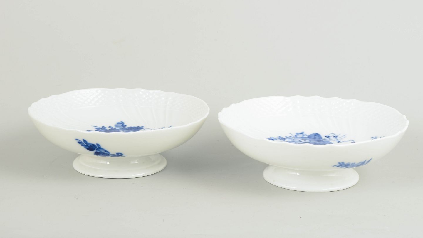 Royal Copenhagen Blå Blomst Svejfet, sæt af to små opsatsskåle.Sæt af to små opsatsskåle i håndmalet porcelæn fra Blå Blomst Svejfet med klassisk underglasurdekoration i koboltblå med naturalistisk blomstermotiv og svejfet form. Model 10/1532. Første sortering. Fremstillet i 1961.