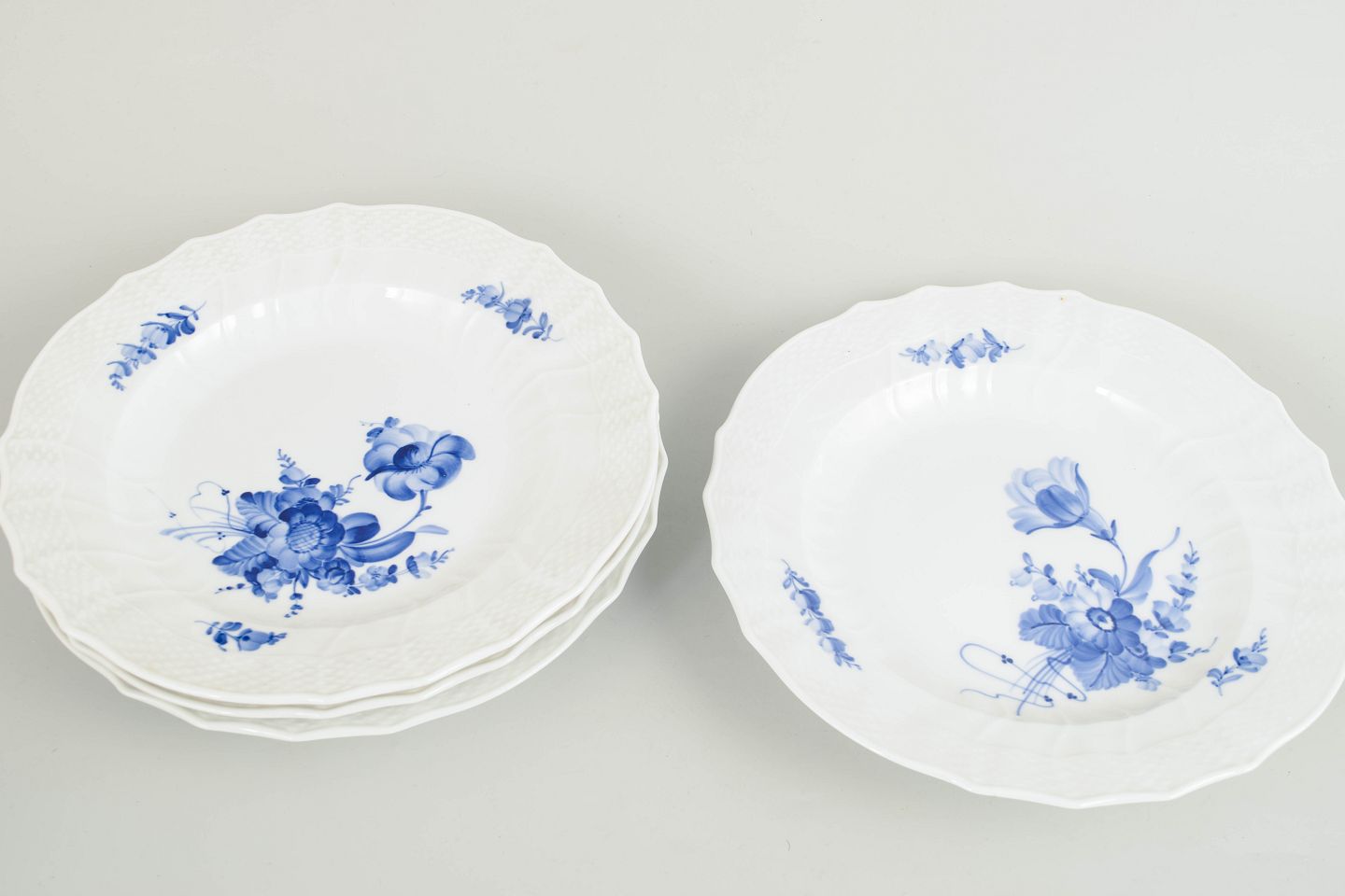 Royal Copenhagen Blå Blomst Svejfet, sæt af fire middagstallerkener.Sæt af fire middagstallerkener i håndmalet porcelæn fra Blå Blomst Svejfet med klassisk underglasurdekoration i koboltblå med naturalistisk blomstermotiv og svejfet kant. Model 10/1621. Første sortering. Fremstillet i 1957.