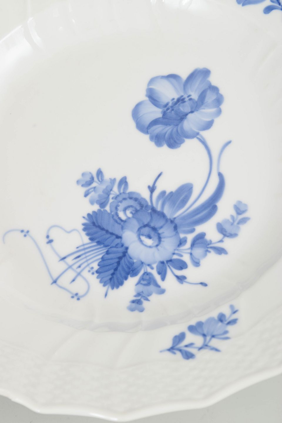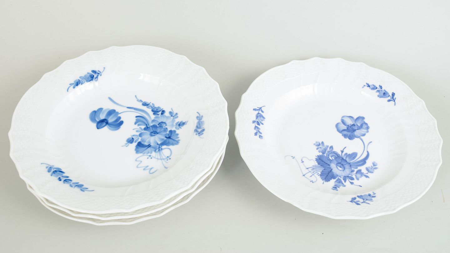 Royal Copenhagen Blå Blomst Svejfet, sæt af fire middagstallerkener.Sæt af fire middagstallerkener i håndmalet porcelæn fra Blå Blomst Svejfet med klassisk underglasurdekoration i koboltblå med naturalistisk blomstermotiv og svejfet kant. Model 10/1621. Første sortering. Fremstillet i 1957.