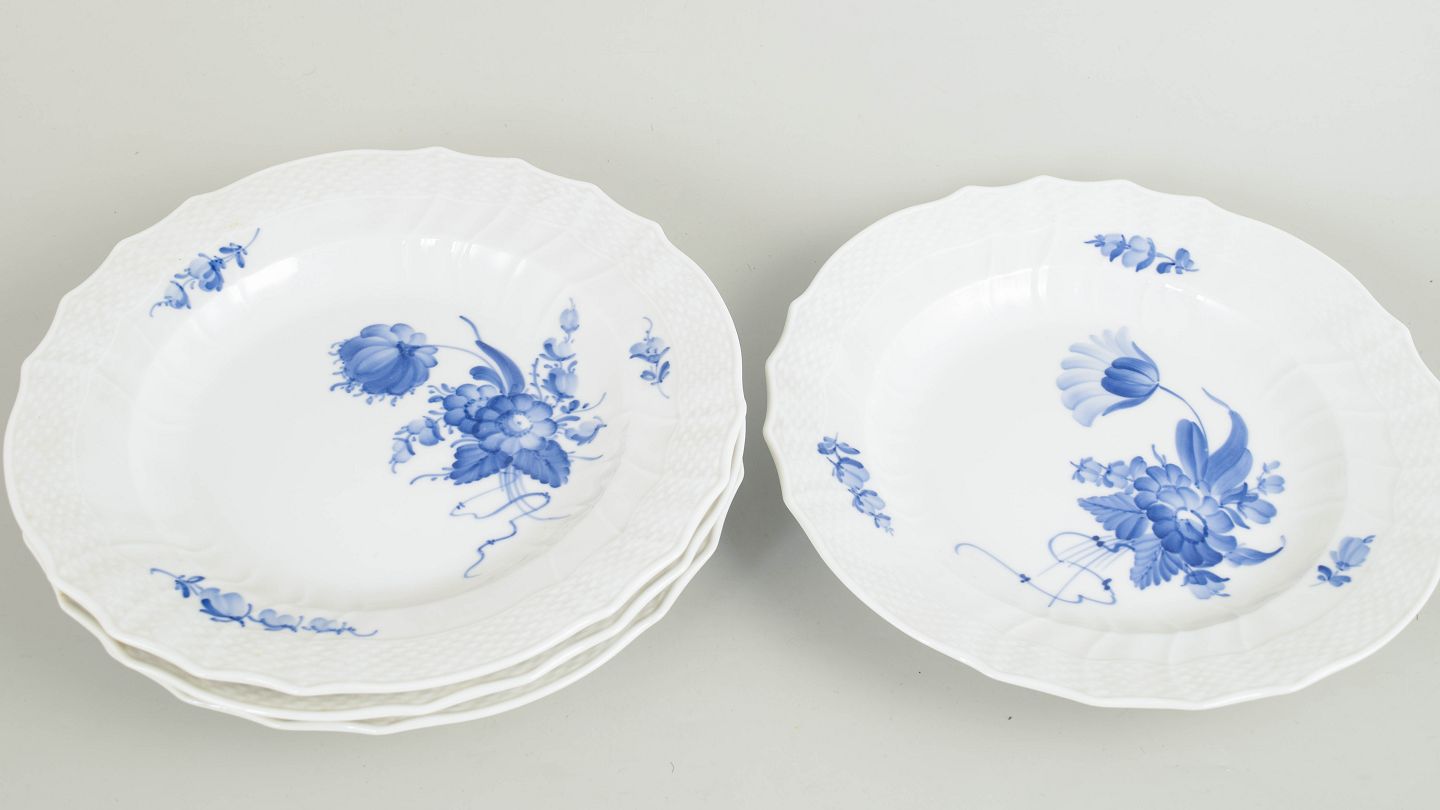 Royal Copenhagen Blå Blomst Svejfet, sæt af fire middagstallerkener.Sæt af fire middagstallerkener i håndmalet porcelæn fra Blå Blomst Svejfet med klassisk underglasurdekoration i koboltblå med naturalistisk blomstermotiv og svejfet kant. Model 10/1621. Første sortering. Fremstillet i 1957.