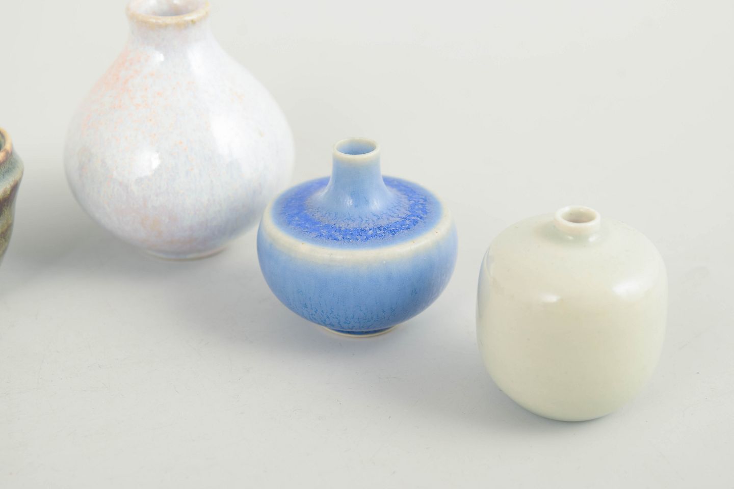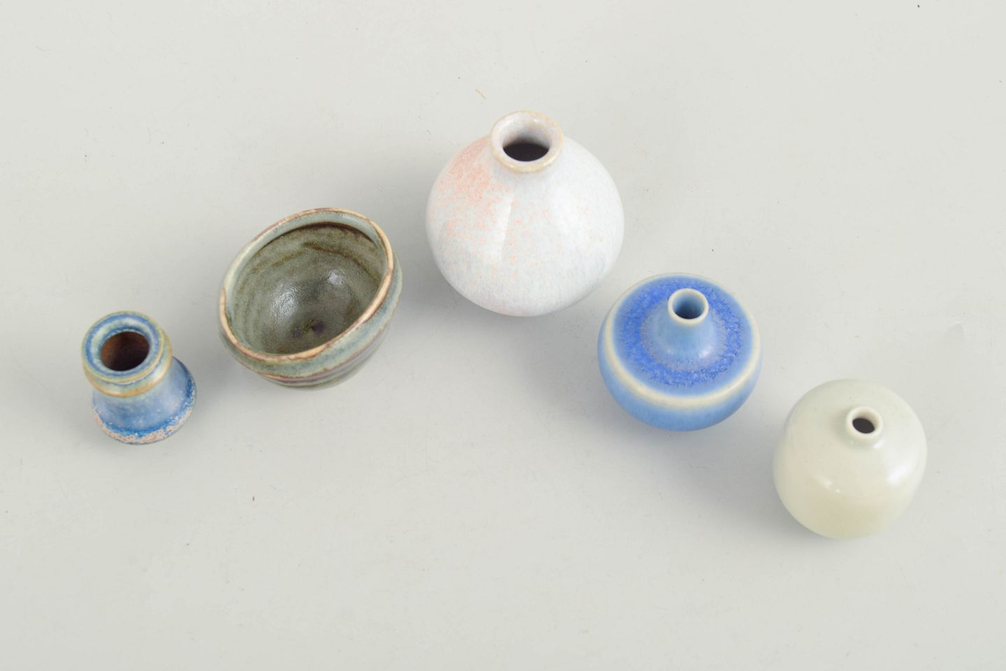 Sæt af fem miniature skåle og vaser i keramik.Samling af fem miniature keramikgenstande bestående af små skåle og vaser i forskellige former og glasurer. Fremstillet i keramik med flerfarvede glasurer i blå, grønne og lyse nuancer. Tre eksemplarer er fra Höganäs og andre fra forskellige producenter, herunder et umærket eksemplar.